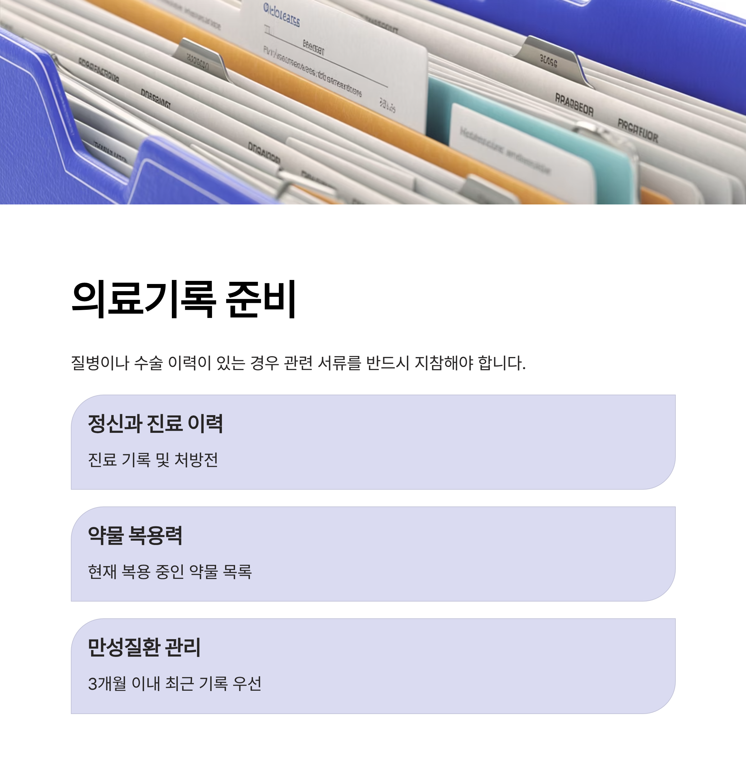 질병이나 수술 이력이 있는 경우 관련 의료기록이나 의사 소견서를 반드시 지참해야 합니다.