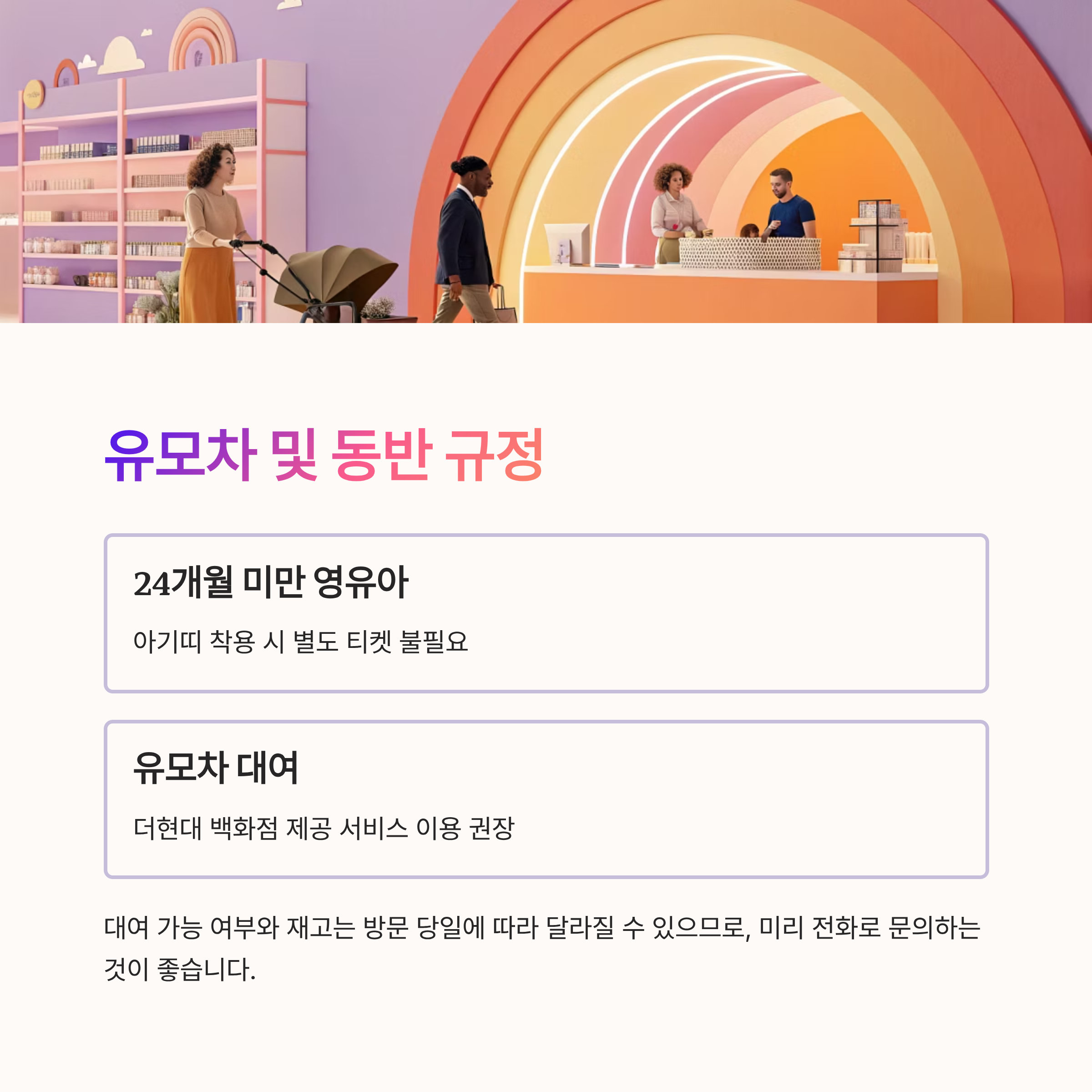 24개월 미만의 영유아는 아기띠를 착용하면 별도의 티켓이 필요 없습니다. 하지만 유모차를 가져가려면 더현대 백화점에서 제공하는 유모차 대여 서비스를 이용하는 것이 좋습니다. 대여 가능 여부와 재고는 방문 당일에 따라 달라질 수 있으므로, 미리 전화로 문의하는 것이 좋습니다.