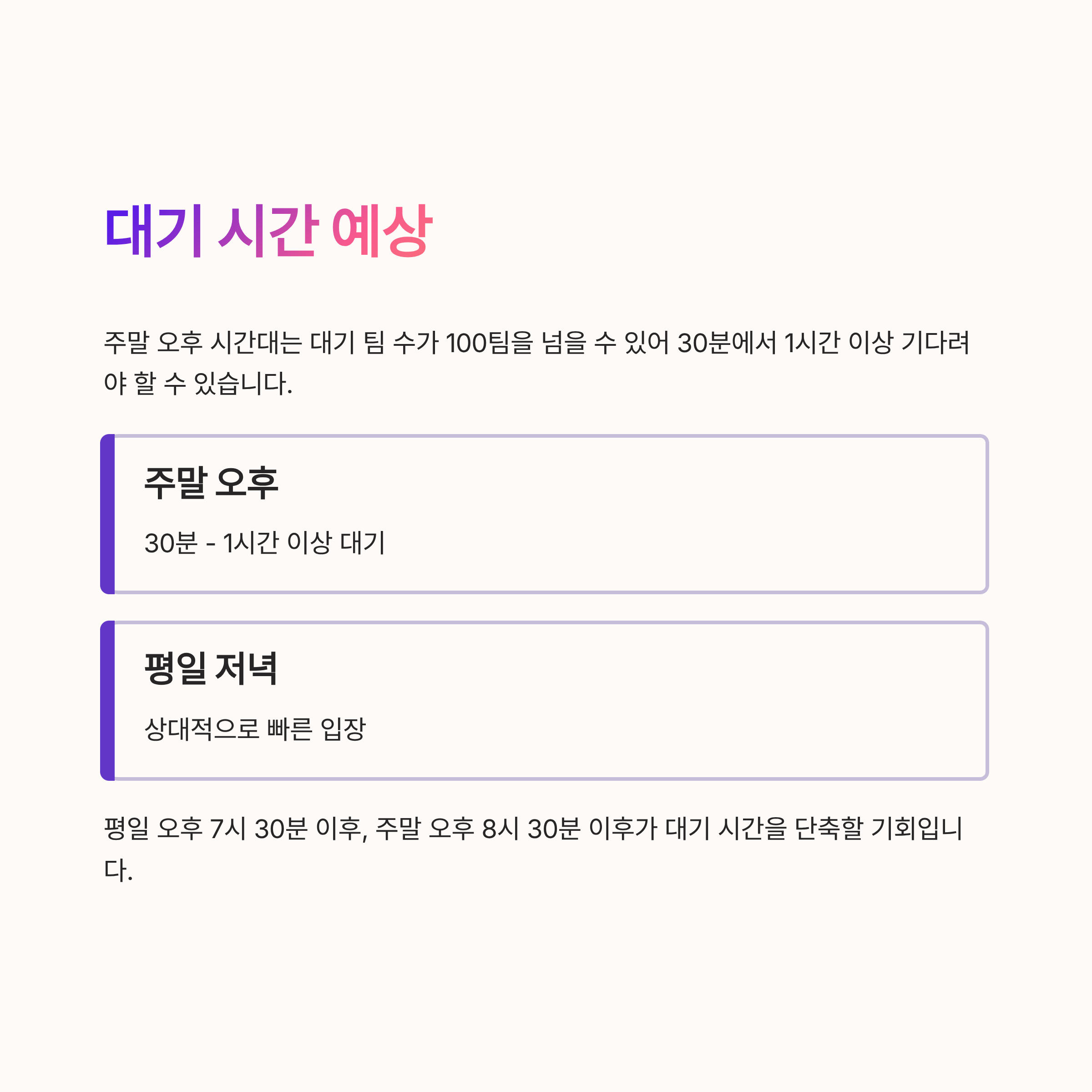 주말 오후 시간대는 대기 팀 수가 100팀을 넘을 수 있어 30분에서 1시간 이상 기다려야 할 수 있습니다. 반면 평일 저녁 시간대나 주말 늦은 시간대는 상대적으로 빠르게 입장 가능합니다. 평일 오후 7시 30분 이후, 주말 오후 8시 30분 이후가 대기 시간을 단축할 기회입니다.