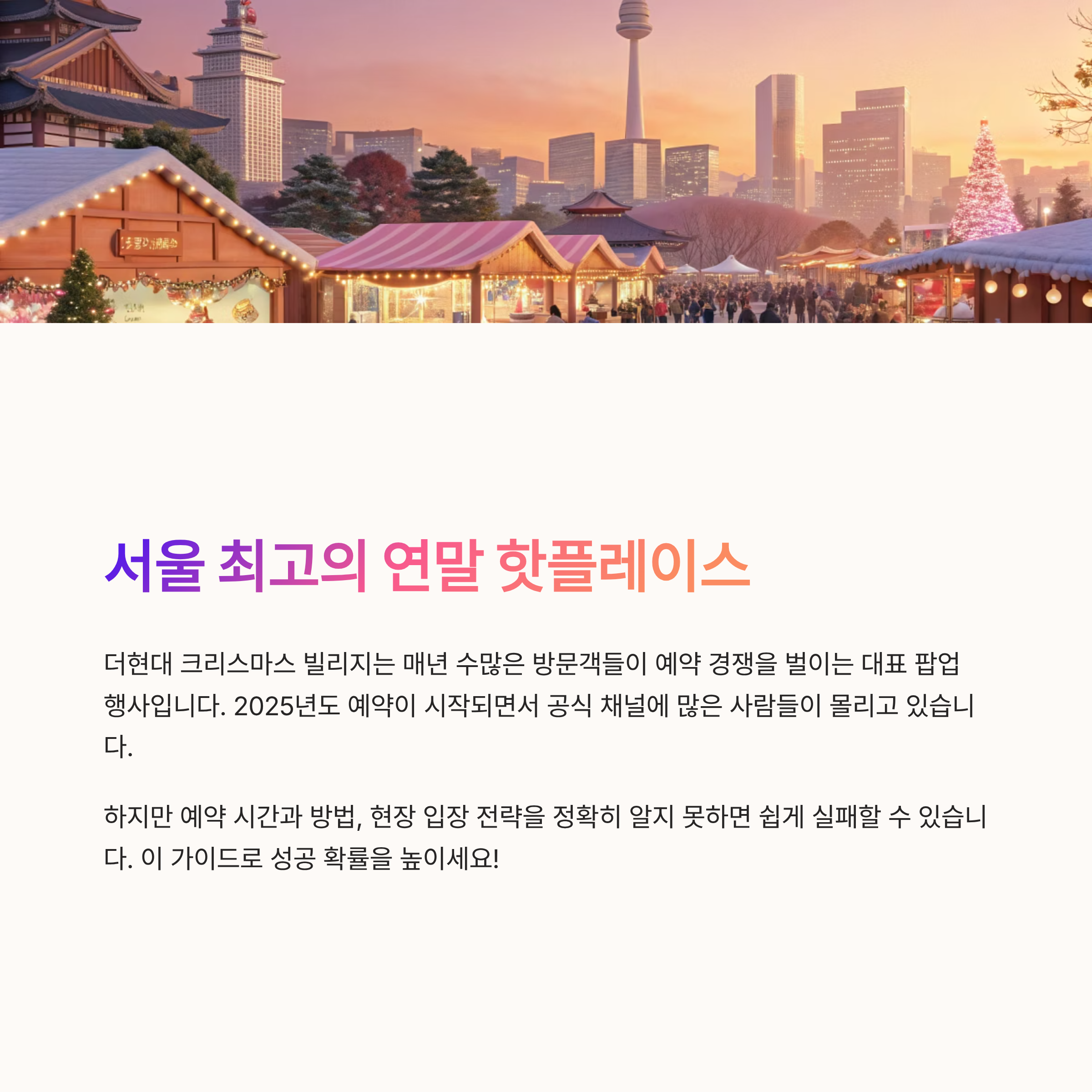 연말 서울의 가장 핫한 명소, 더현대 크리스마스 빌리지는 매년 수많은 방문객들의 예약을 놓고 경쟁하는 대표 팝업 행사입니다. 2025년도 예약이 시작되면서 수많은 사람들이 공식 채널을 들락거리고 있습니다. 하지만 예약 시간과 방법, 그리고 현장 입장 전략을 정확히 알지 못하면 쉽게 실패할 수 있습니다. 이 글에서는 더현대 크리스마스 빌리지의 모든 예약 일정, 성공 전략, 현장 팁을 단계별로 설명합니다.