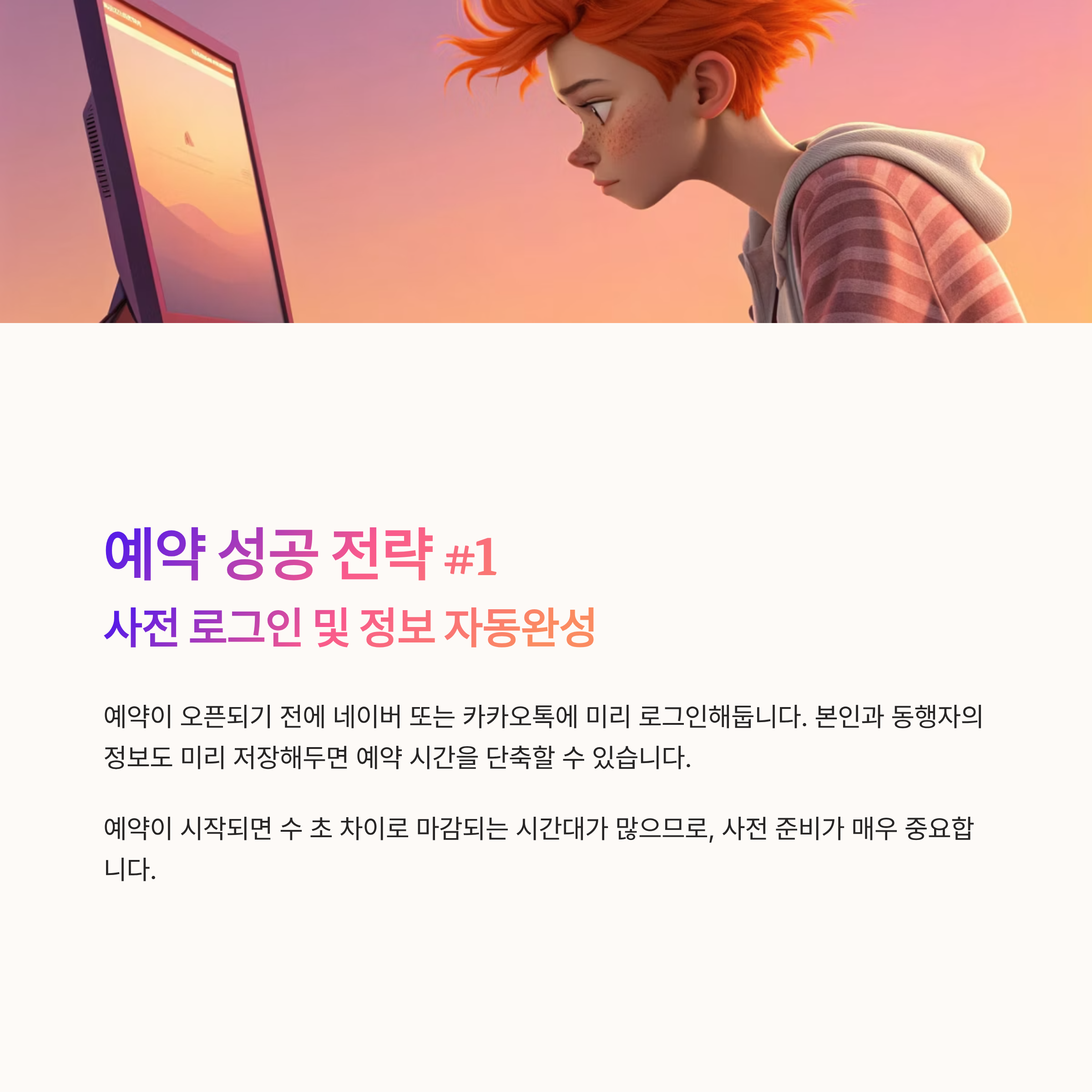 예약이 오픈되기 전에 네이버 또는 카카오톡에 미리 로그인해둡니다. 본인과 동행자의 정보도 미리 저장해두면 예약 시간을 단축할 수 있습니다. 예약이 시작되면 수 초 차이로 마감되는 시간대가 많으므로, 사전 준비가 매우 중요합니다.