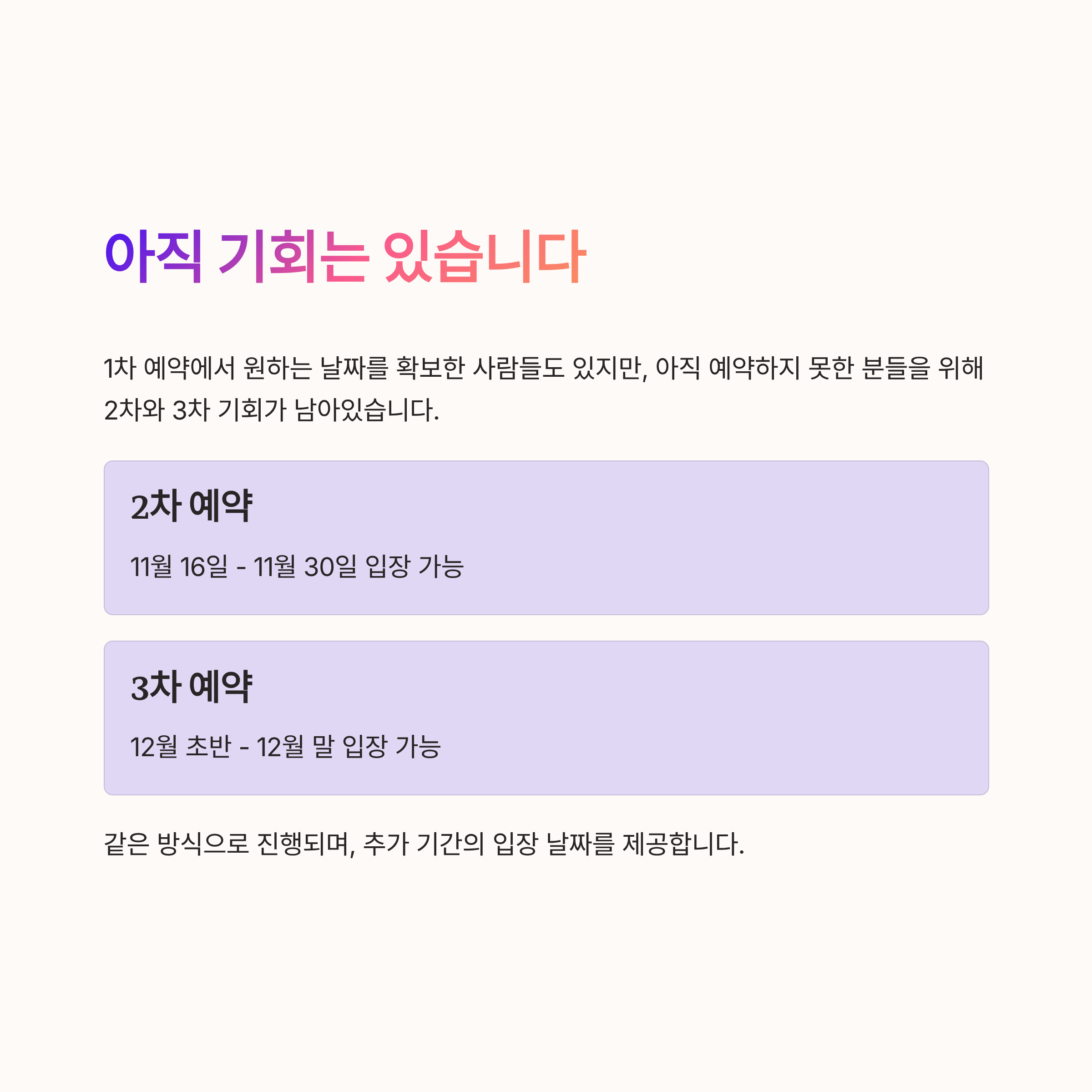 1차 예약에서 이미 원하는 날짜를 확보한 사람들도 있지만, 아직 예약하지 못한 사람들을 위해 2차와 3차 기회가 있습니다. 2차와 3차 예약은 같은 방식으로 진행되며, 추가 기간의 입장 날짜를 제공합니다.
