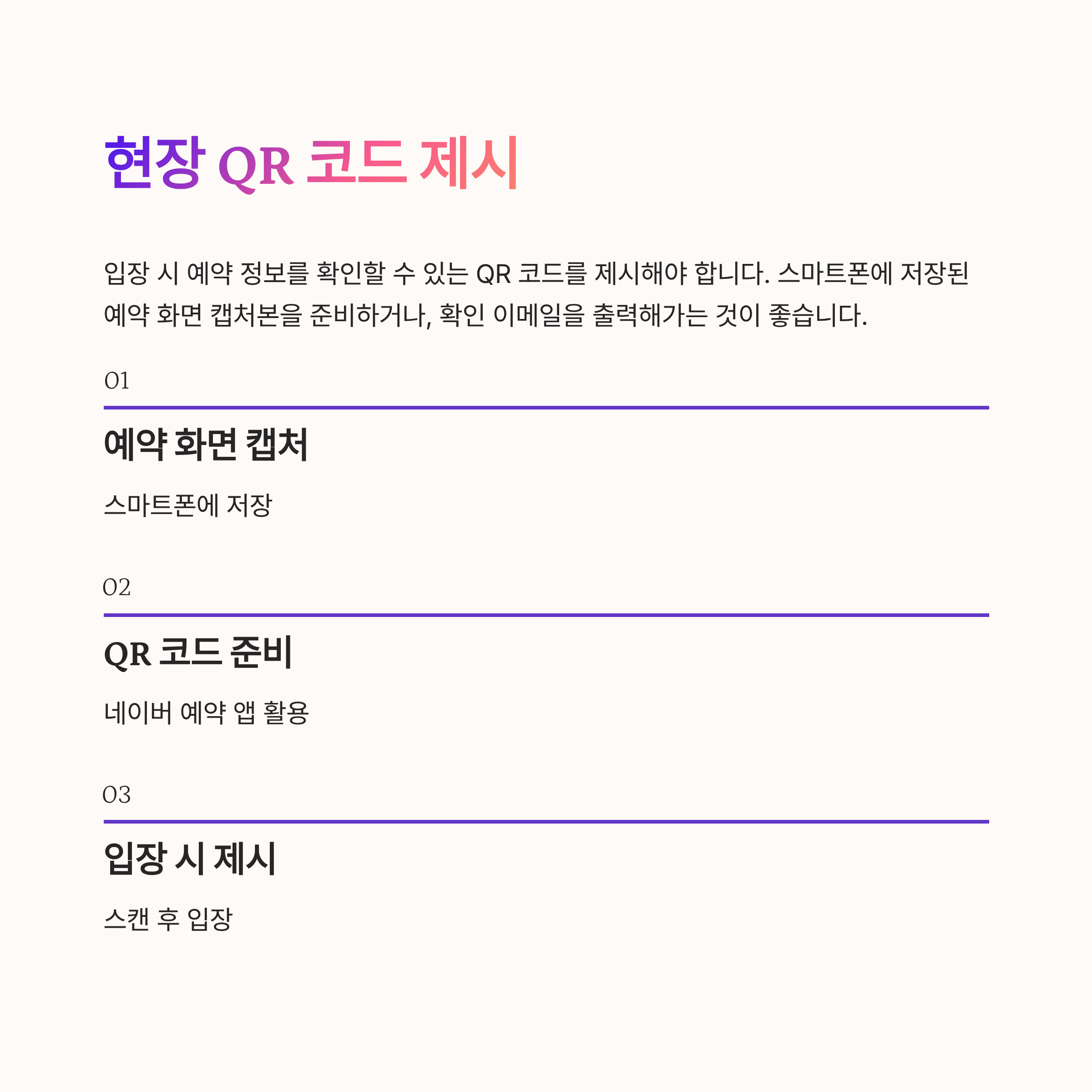입장 시 예약 정보를 확인할 수 있는 QR 코드를 제시해야 합니다. 스마트폰에 저장된 예약 화면 캡처본을 준비하거나, 확인 이메일을 출력해가는 것이 좋습니다. 네이버 예약 앱에서 바로 QR 코드를 스캔받을 수도 있습니다.