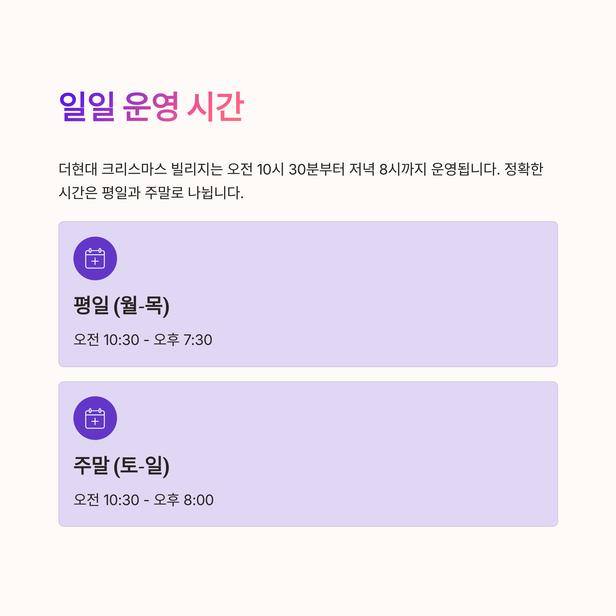 더현대 크리스마스 빌리지는 오전 10시 30분부터 저녁 8시까지 운영됩니다. 단, 정확한 시간은 평일과 주말로 나뉩니다. 평일(월요일부터 목요일)에는 오전 10시 30분부터 오후 7시 30분까지 운영되며, 토요일과 일요일을 포함한 주말에는 오전 10시 30분부터 오후 8시까지 운영됩니다.