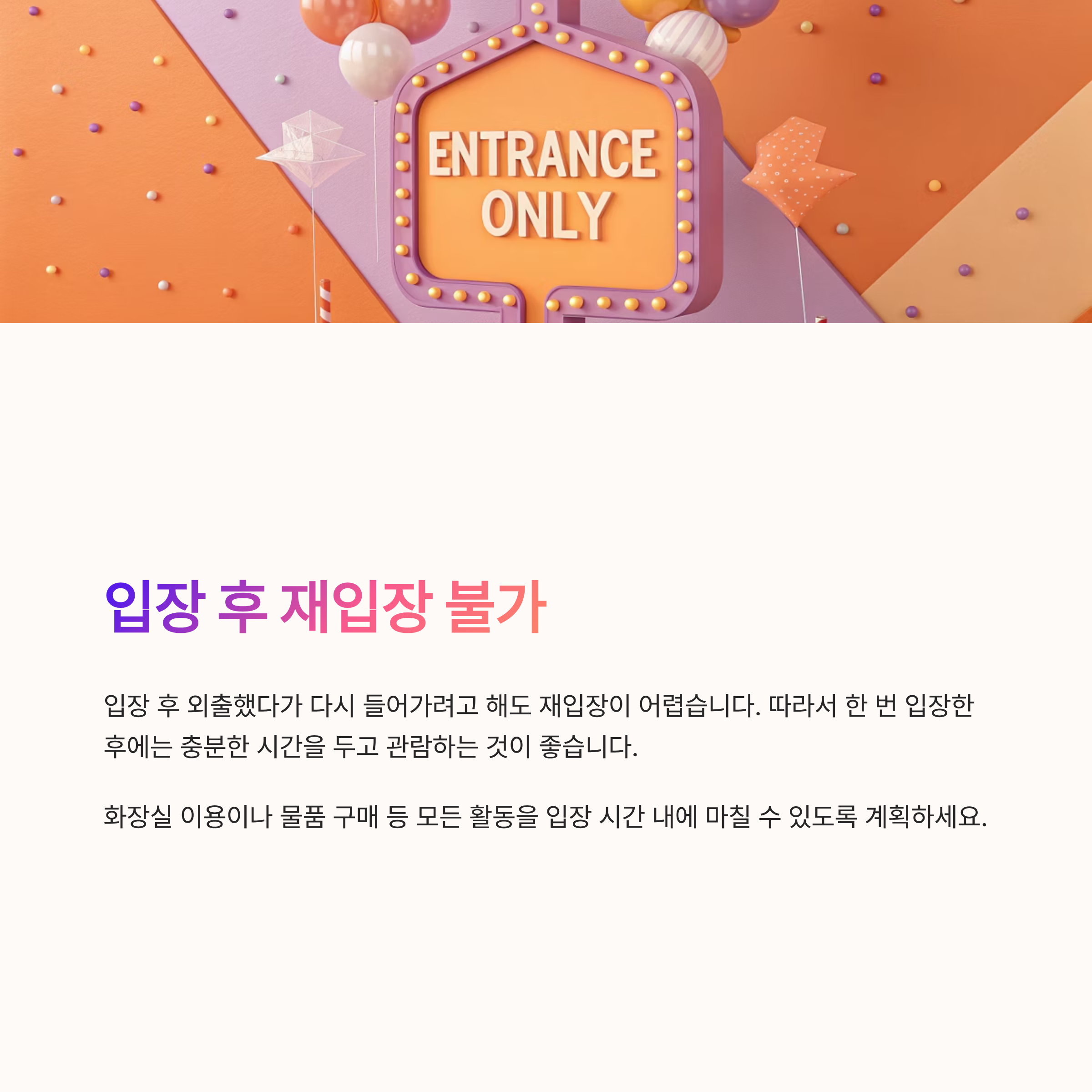 입장 후 외출했다가 다시 들어가려고 해도 재입장이 어렵습니다. 따라서 한 번 입장한 후에는 충분한 시간을 두고 관람하는 것이 좋습니다. 화장실 이용이나 물품 구매 등 모든 활동을 입장 시간 내에 마칠 수 있도록 계획하세요.