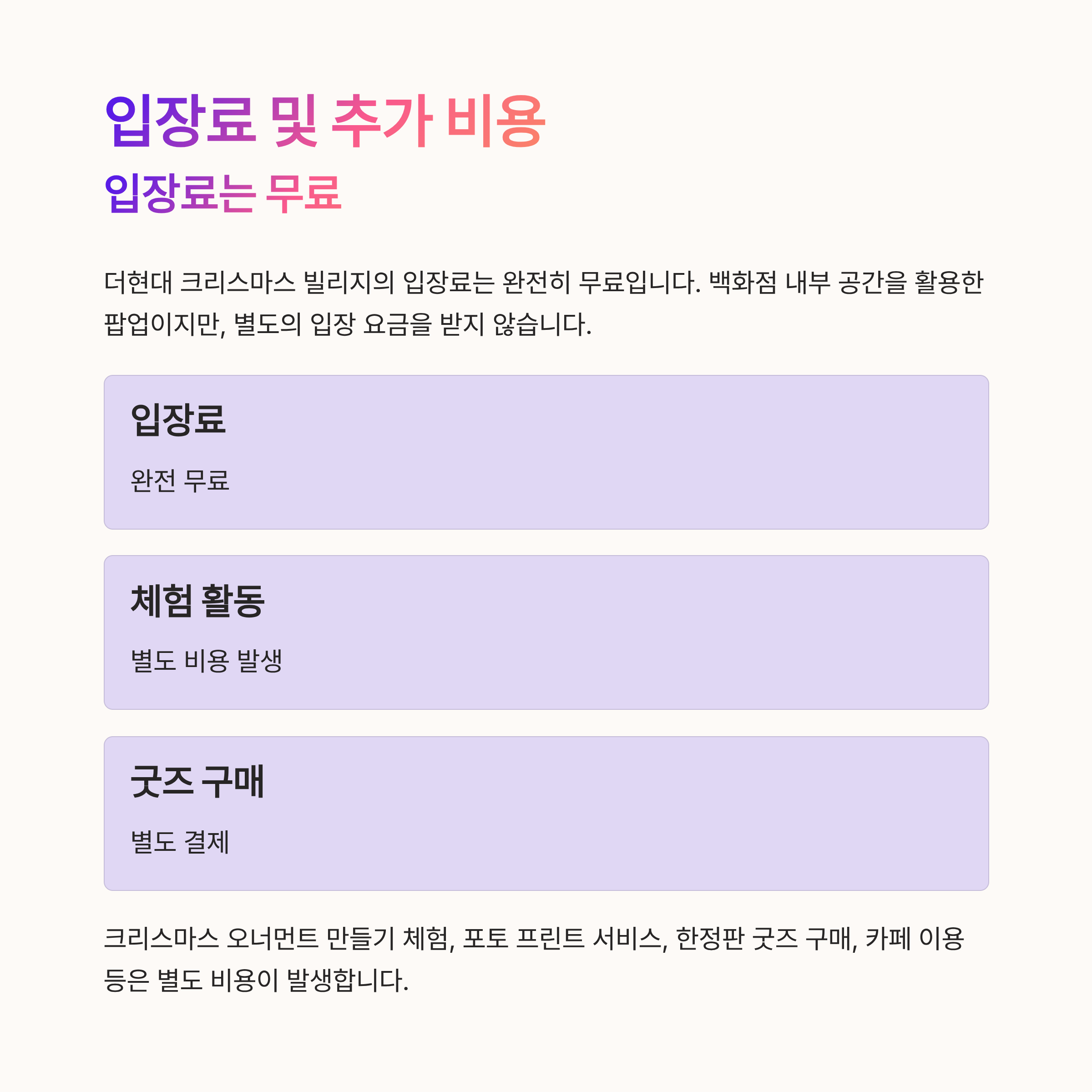 입장은 무료이지만, 내부의 특정 활동이나 상품 구매 시 별도 비용이 발생할 수 있습니다. 크리스마스 오너먼트 만들기 체험, 포토 프린트 서비스, 한정판 굿즈 구매 등이 그 예입니다. 또한 더현대 내 카페나 음식점에서 음료나 디저트를 구매할 수 있으며, 이는 모두 별도 결제입니다.