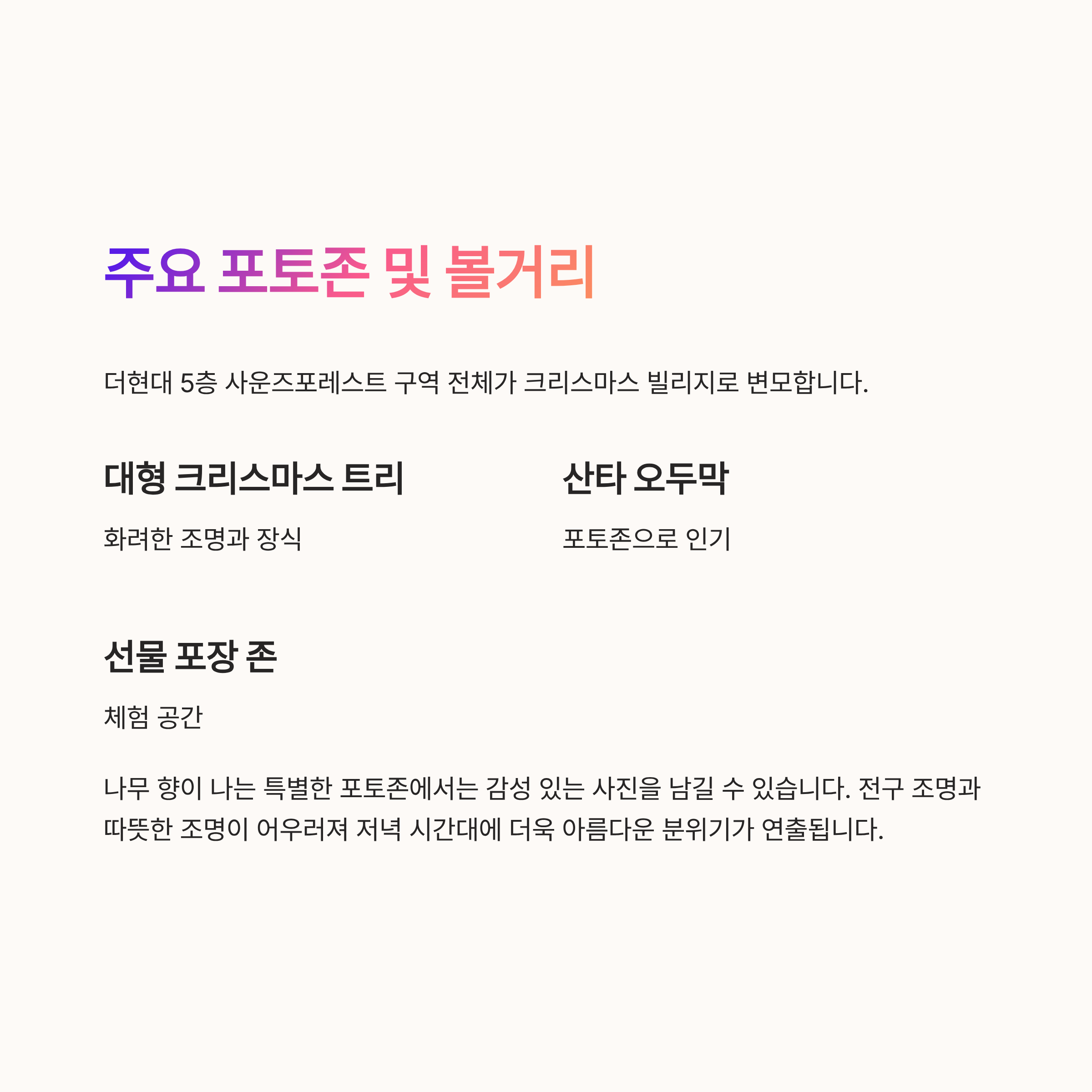 더현대 5층 사운즈포레스트 구역 전체가 크리스마스 빌리지로 변모합니다. 대형 크리스마스 트리, 산타 오두막, 선물 포장 존, 우편 국 등 다양한 테마 공간이 마련됩니다. 나무 향이 나는 특별한 포토존에서는 감성 있는 사진을 남길 수 있습니다. 전구 조명과 따뜻한 조명이 어우러져 저녁 시간대에 더욱 아름다운 분위기가 연출됩니다.