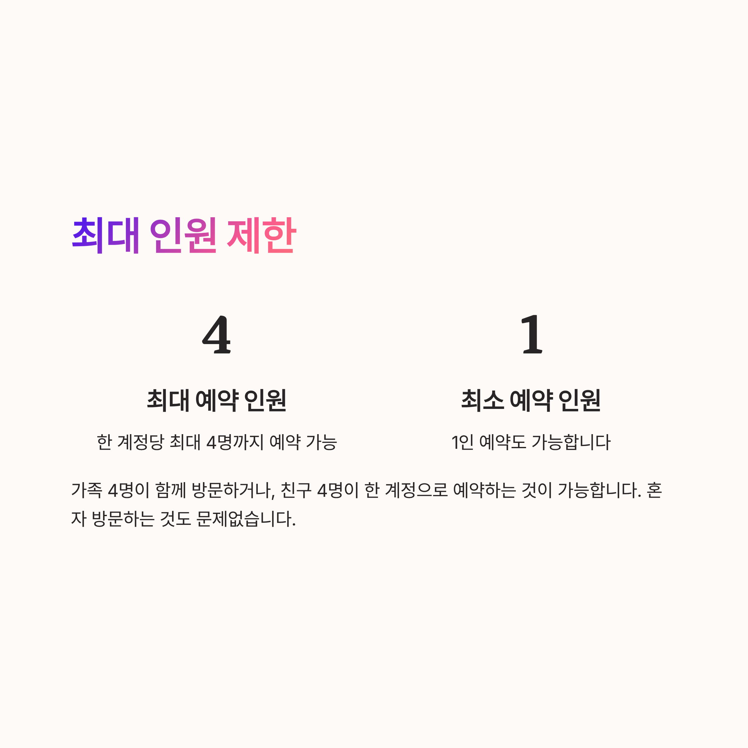 한 계정당 최대 4명까지 예약할 수 있습니다. 가족 4명이 함께 방문하거나, 친구 4명이 한 계정으로 예약하는 것이 가능합니다. 다만 1인 예약도 가능하므로, 혼자 방문하는 것도 문제없습니다.