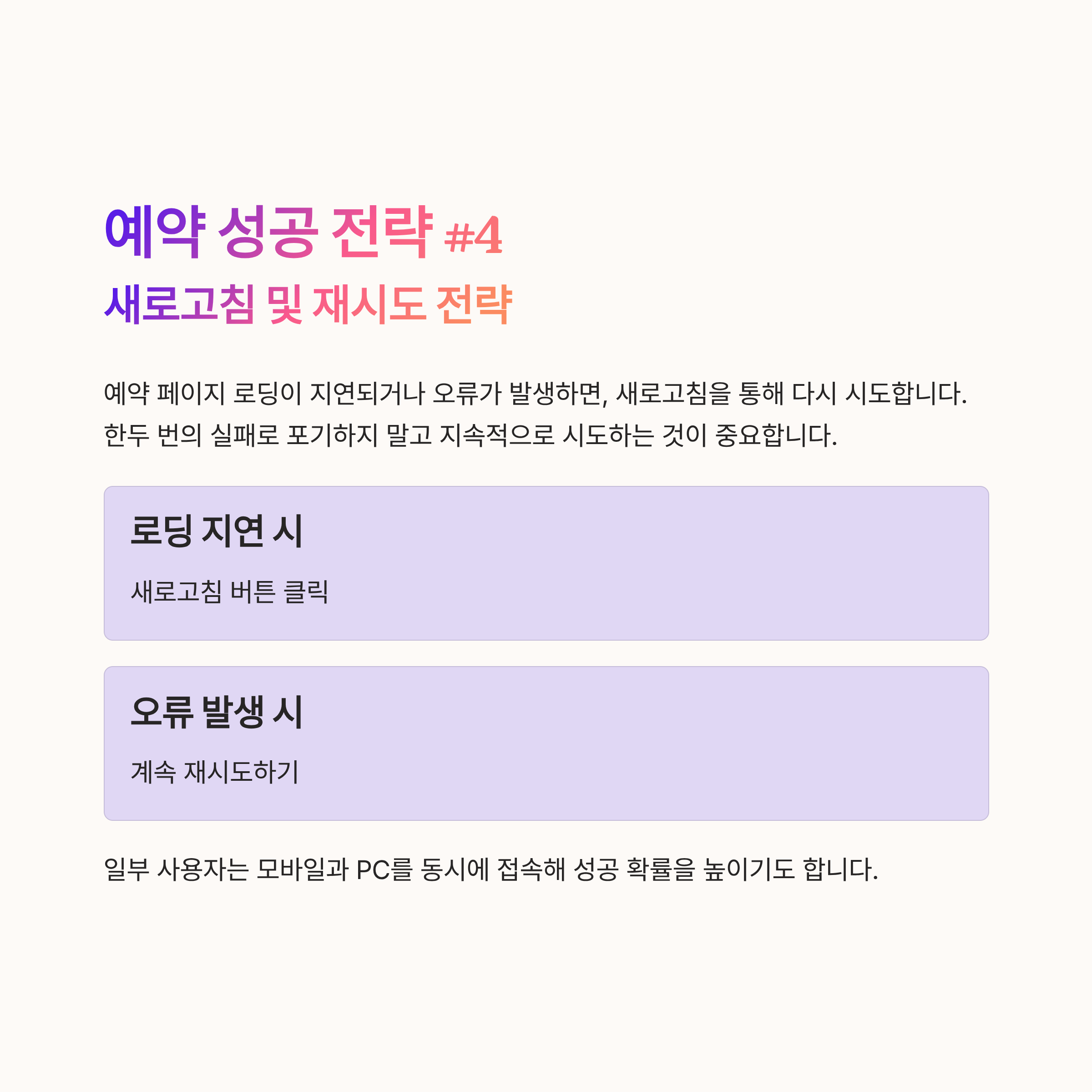 예약 페이지 로딩이 지연되거나 오류가 발생하면, 새로고침을 통해 다시 시도합니다. 한 두 번의 실패로 포기하지 말고 지속적으로 시도하는 것이 중요합니다. 일부 사용자는 모바일과 PC를 동시에 접속해 성공 확률을 높이기도 합니다.