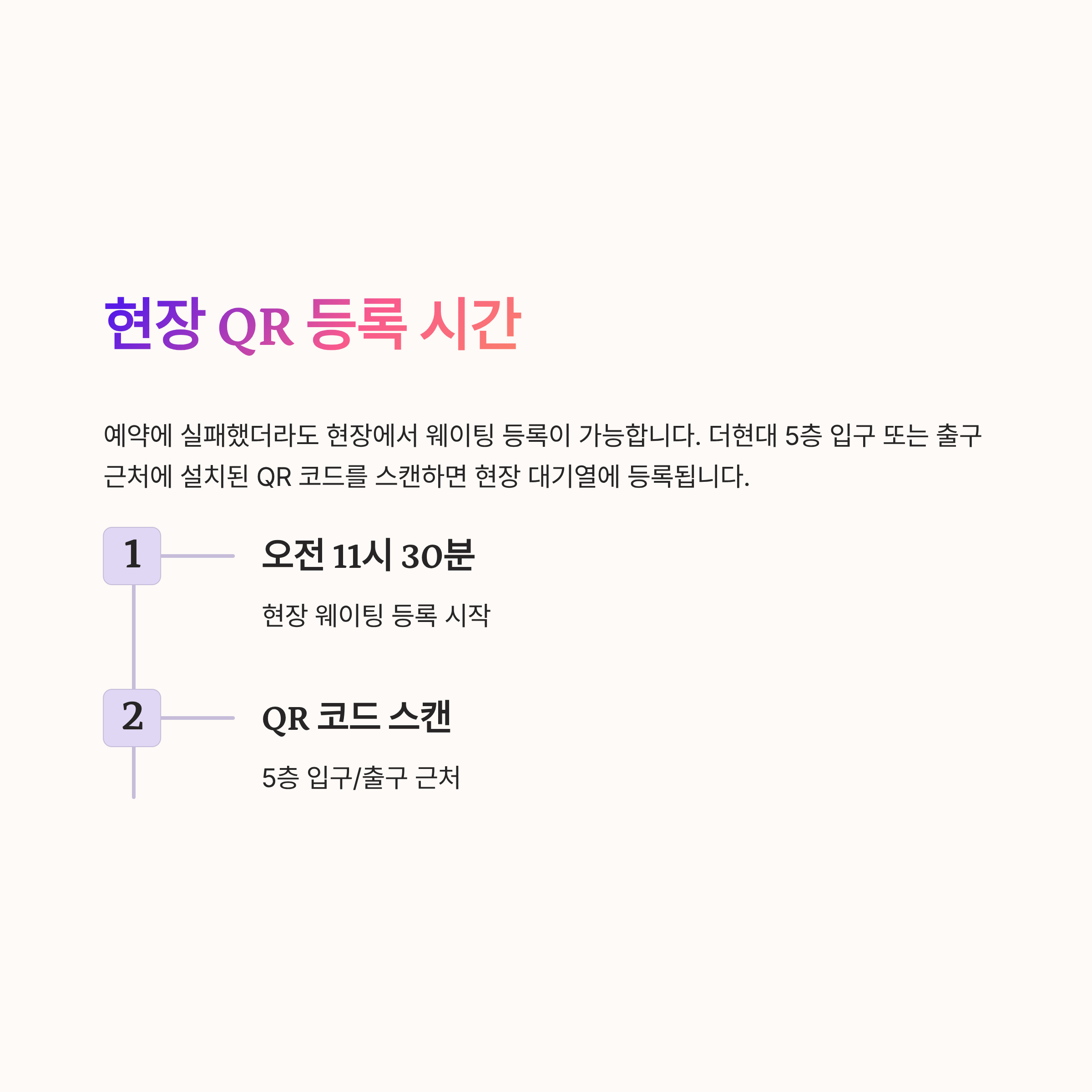 예약에 실패했더라도 현장에서 웨이팅 등록이 가능합니다. 더현대 5층 입구 또는 출구 근처에 설치된 QR 코드를 스캔하면 현장 대기열에 등록됩니다. 현장 웨이팅은 오전 11시 30분부터 등록이 시작됩니다.