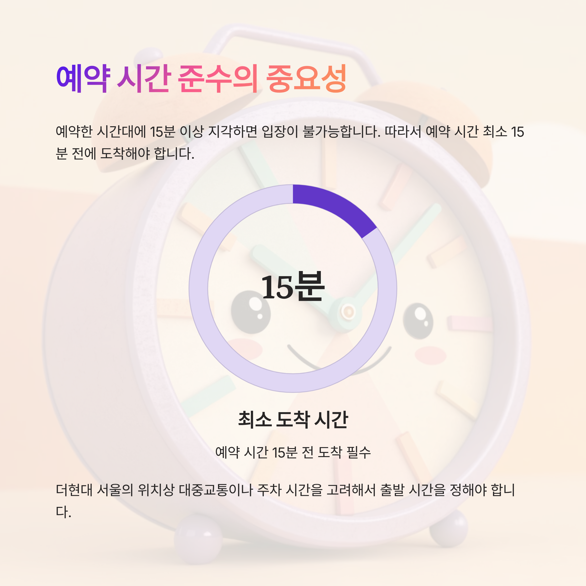 예약한 시간대에 15분 이상 지각하면 입장이 불가능합니다. 따라서 예약 시간 최소 15분 전에 도착해야 합니다. 더현대 서울의 위치상 대중교통이나 주차 시간을 고려해서 출발 시간을 정해야 합니다.