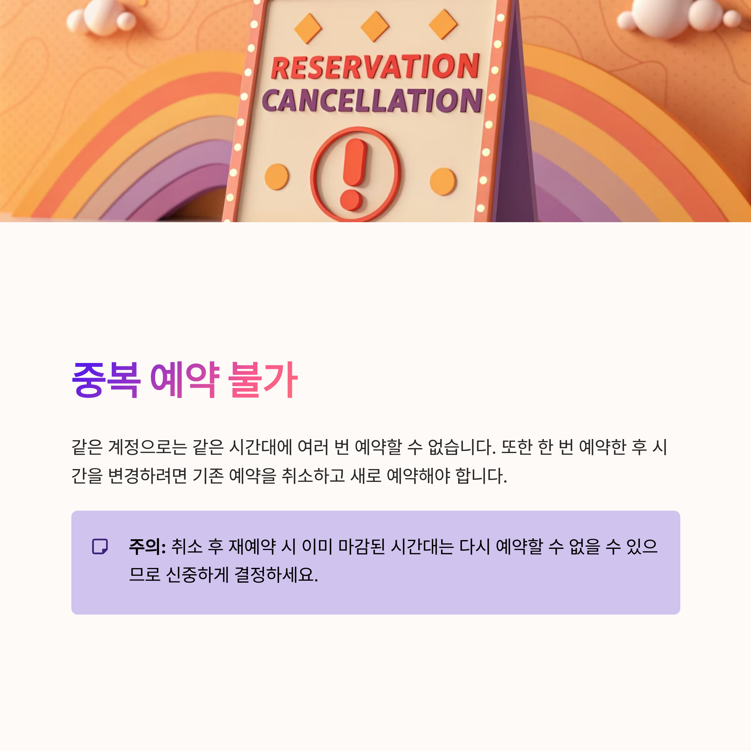 같은 계정으로는 같은 시간대에 여러 번 예약할 수 없습니다. 또한 한 번 예약한 후 시간을 변경하려면 기존 예약을 취소하고 새로 예약해야 합니다. 취소 후 재예약 시 이미 마감된 시간대는 다시 예약할 수 없을 수 있으므로 주의해야 합니다.