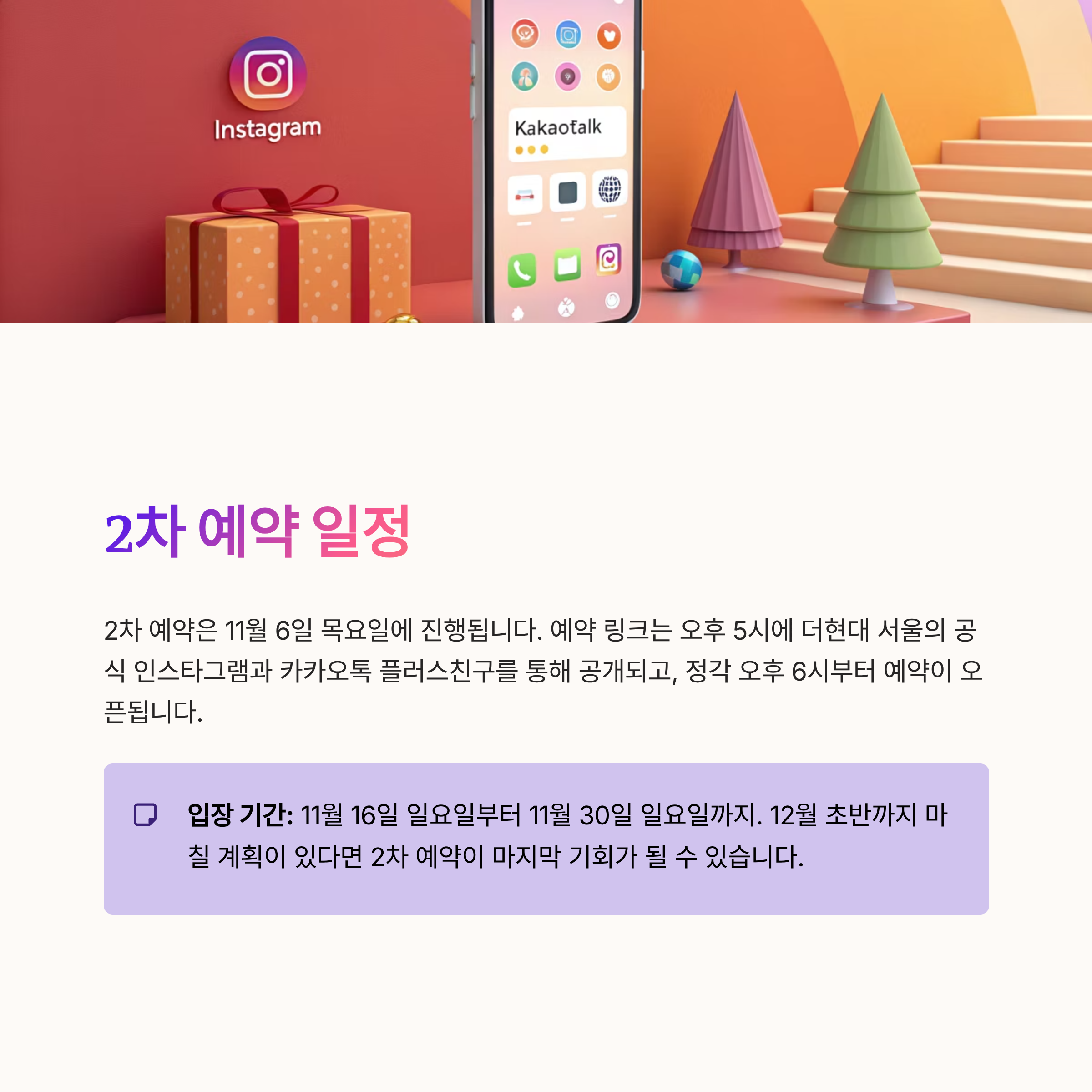 2차 예약은 11월 6일 목요일에 진행됩니다. 예약 링크는 오후 5시에 더현대 서울의 공식 인스타그램과 카카오톡 플러스친구를 통해 공개되고, 정각 오후 6시부터 예약이 오픈됩니다. 2차 예약으로 입장할 수 있는 기간은 11월 16일 일요일부터 11월 30일 일요일까지입니다. 12월 초반까지 마칠 계획이 있다면 2차 예약이 마지막 기회가 될 수 있습니다.
