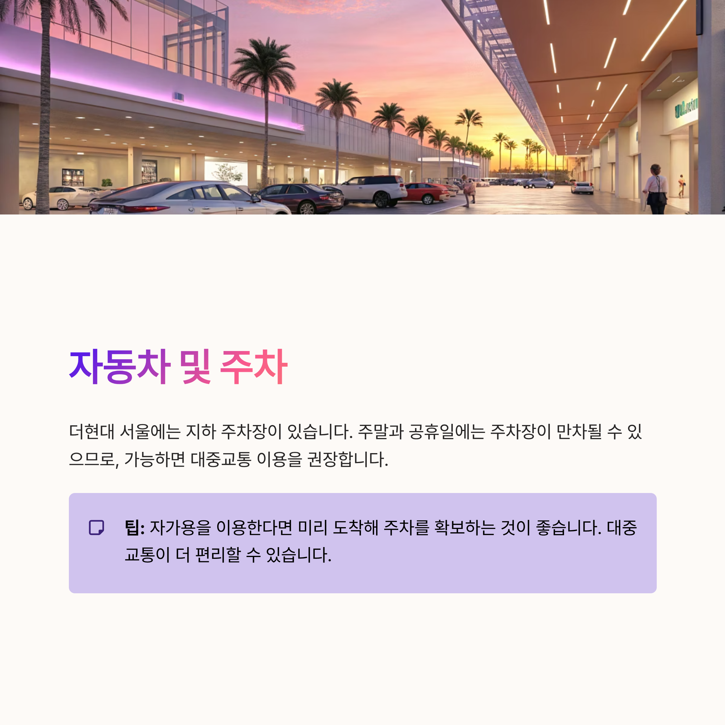 더현대 서울에는 지하 주차장이 있습니다. 주말과 공휴일에는 주차장이 만차될 수 있으므로, 가능하면 대중교통 이용을 권장합니다. 자가용을 이용한다면 미리 도착해 주차를 확보하는 것이 좋습니다.