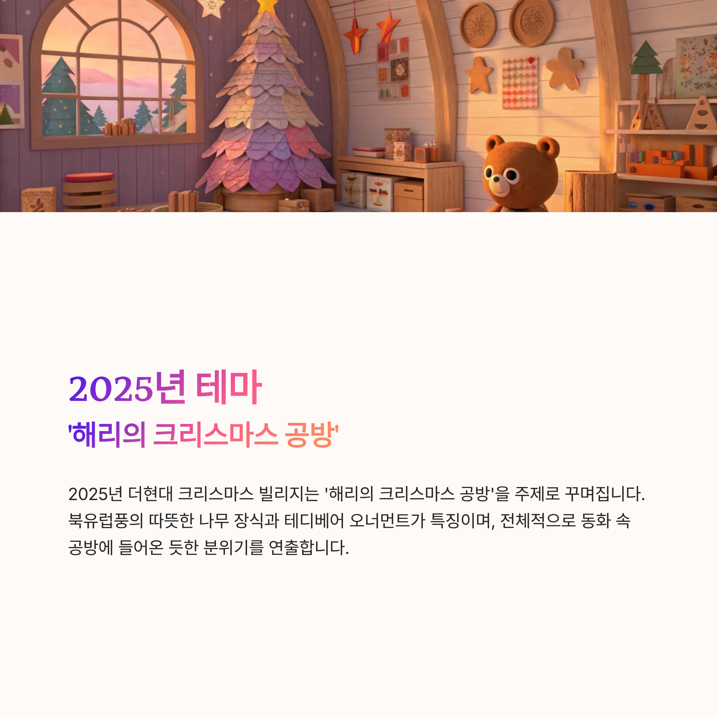 2025년 더현대 크리스마스 빌리지는 '해리의 크리스마스 공방'을 주제로 꾸며집니다. 북유럽풍의 따뜻한 나무 장식과 테디베어 오너먼트가 특징이며, 전체적으로 동화 속 공방에 들어온 듯한 분위기를 연출합니다.