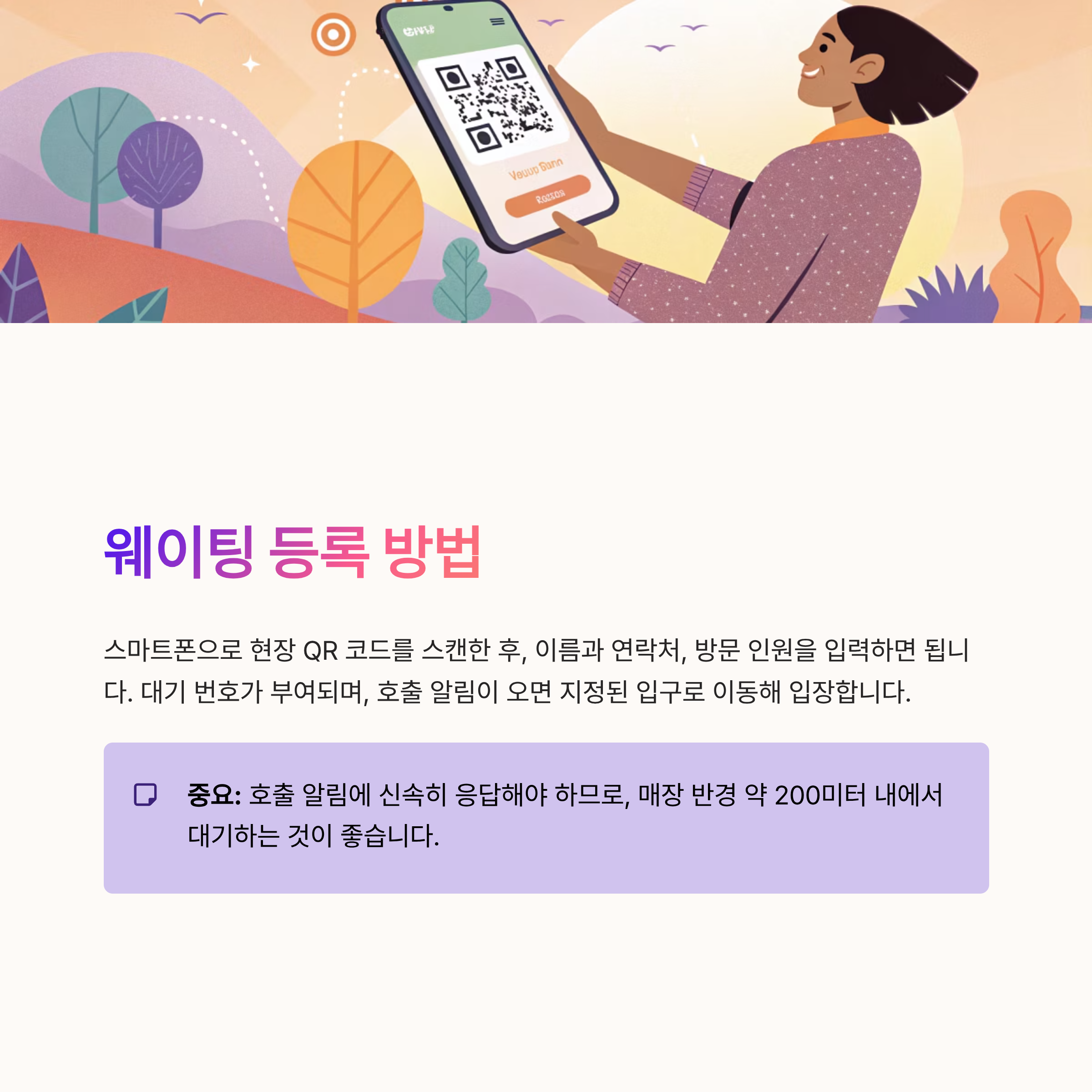 스마트폰으로 현장 QR 코드를 스캔한 후, 이름과 연락처, 방문 인원을 입력하면 됩니다. 대기 번호가 부여되며, 호출 알림이 오면 지정된 입구로 이동해 입장합니다. 호출 알림에 신속히 응답해야 하므로, 매장 반경 약 200미터 내에서 대기하는 것이 좋습니다.