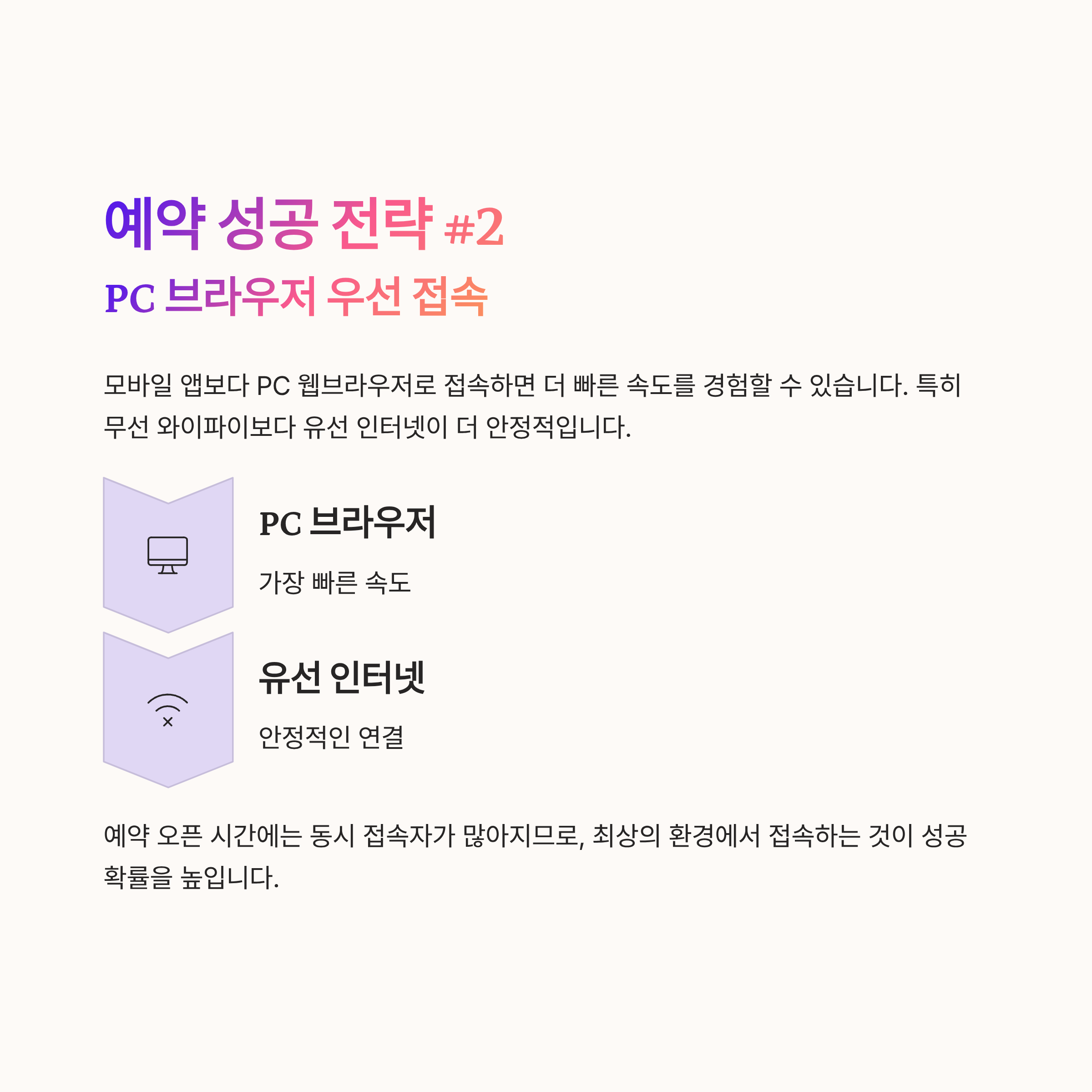 모바일 앱보다 PC 웹브라우저로 접속하면 더 빠른 속도를 경험할 수 있습니다. 특히 무선 와이파이보다 유선 인터넷이 더 안정적입니다. 예약 오픈 시간에는 동시 접속자가 많아지므로, 최상의 환경에서 접속하는 것이 성공 확률을 높입니다.