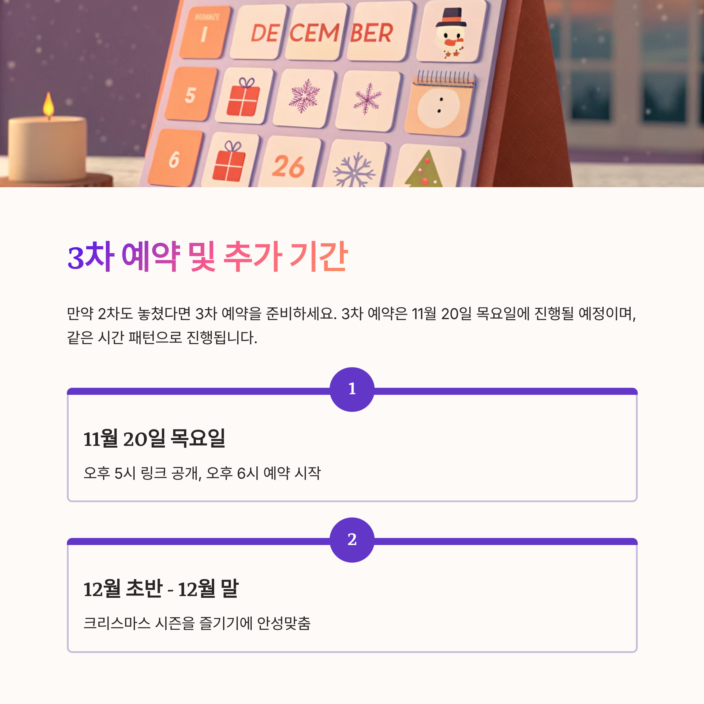 만약 2차도 놓쳤다면 3차 예약을 준비하세요. 3차 예약은 11월 20일 목요일에 진행될 예정이며, 같은 시간 패턴으로 진행됩니다. 3차 예약을 통해 입장할 수 있는 기간은 12월 초반부터 12월 말까지이며, 크리스마스 시즌을 즐기기에 안성맞춤입니다.