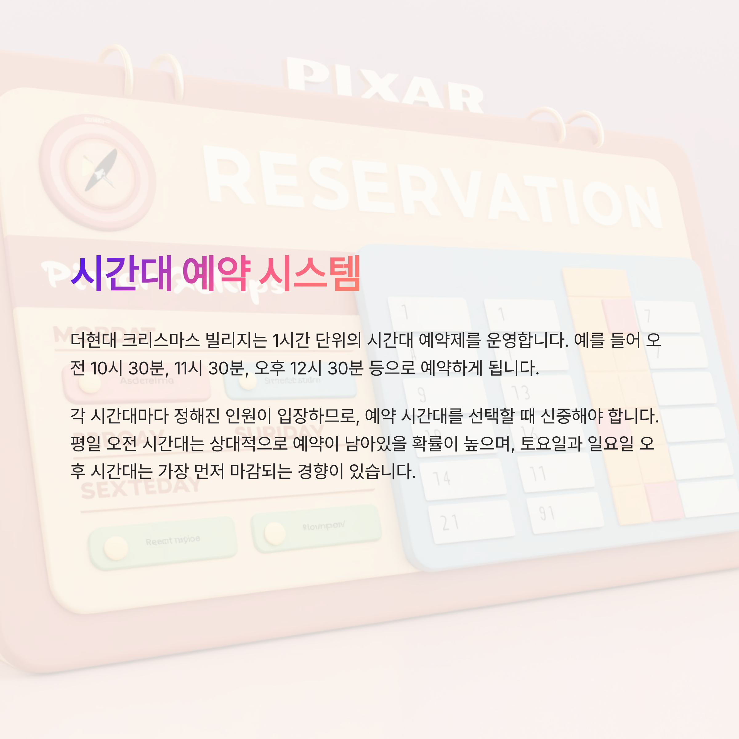 더현대 크리스마스 빌리지는 1시간 단위의 시간대 예약제를 운영합니다. 예를 들어 오전 10시 30분, 11시 30분, 오후 12시 30분 등으로 예약하게 됩니다. 각 시간대마다 정해진 인원이 입장하므로, 예약 시간대를 선택할 때 신중해야 합니다. 평일 오전 시간대는 상대적으로 예약이 남아있을 확률이 높으며, 토요일과 일요일 오후 시간대는 가장 먼저 마감되는 경향이 있습니다.