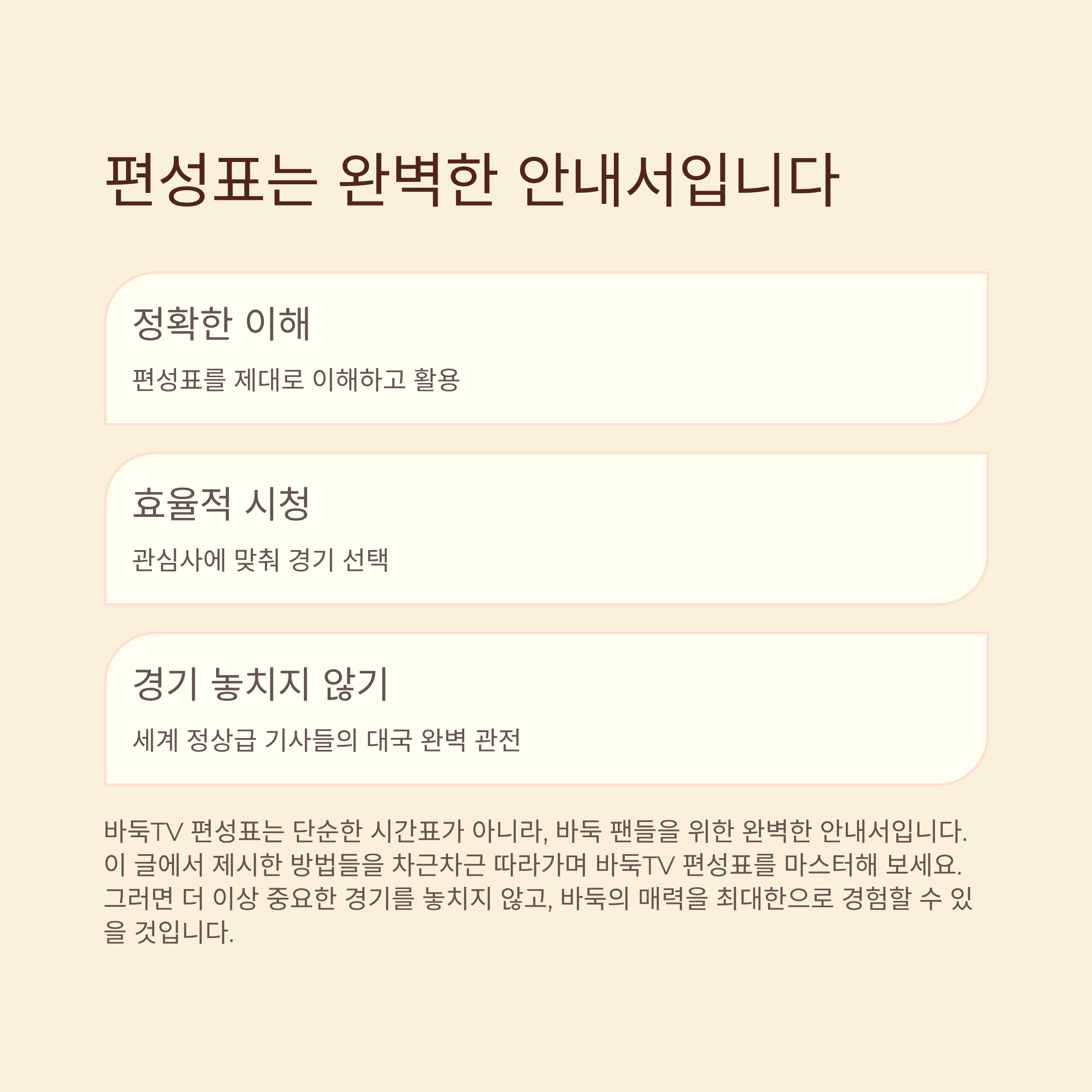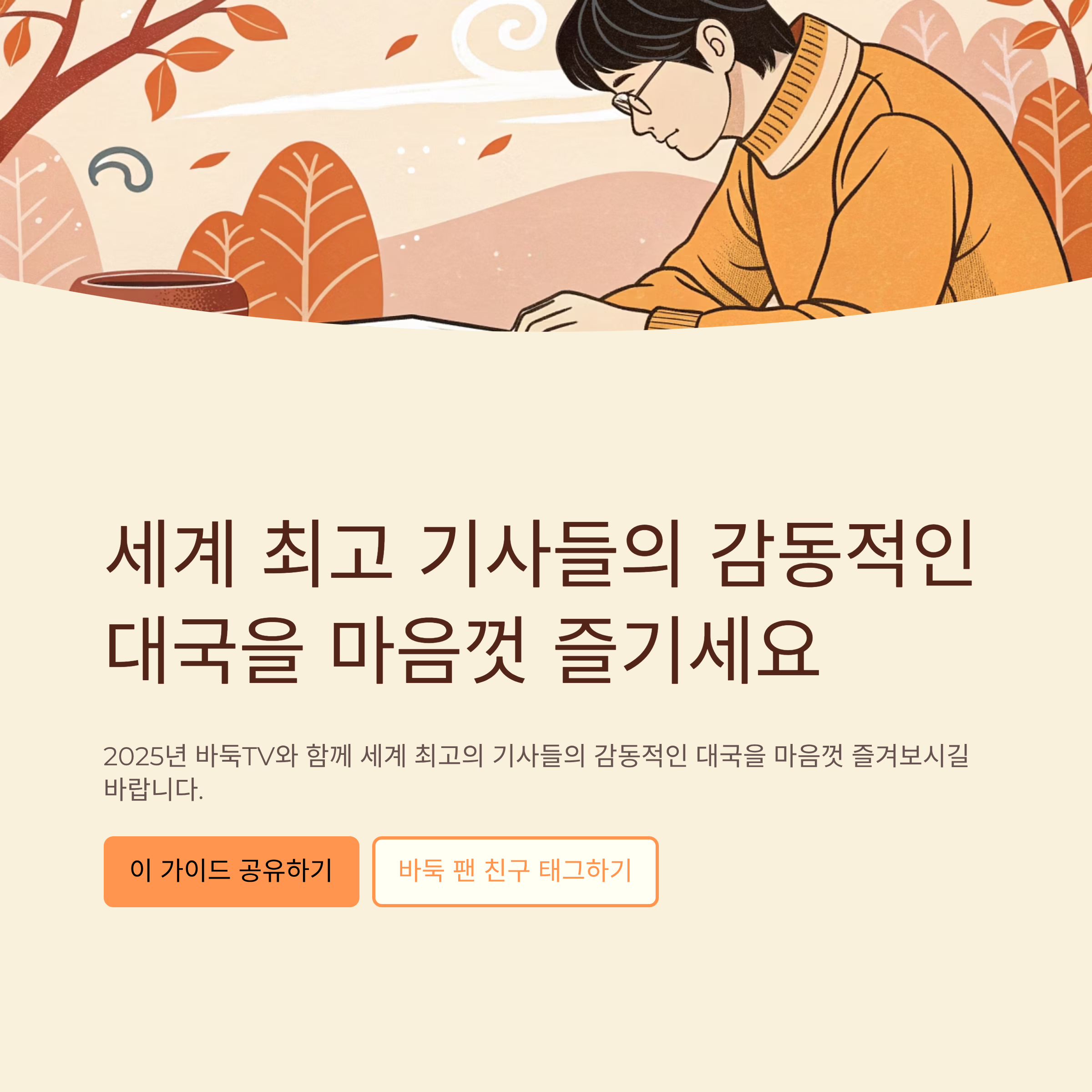 바둑TV 편성표는 단순한 시간표가 아니라, 바둑 팬들을 위한 완벽한 안내서입니다. 편성표를 제대로 이해하고 활용하면, 세계 정상급 기사들의 대국을 놓치지 않고, 자신의 관심사에 맞춰 효율적으로 시청할 수 있습니다. 이 글에서 제시한 방법들을 차근차근 따라가며 바둑TV 편성표를 마스터해 보세요. 그러면 더 이상 중요한 경기를 놓치지 않고, 바둑의 매력을 최대한으로 경험할 수 있을 것입니다. 2025년 바둑TV와 함께 세계 최고의 기사들의 감동적인 대국을 마음껏 즐겨보시길 바랍니다.