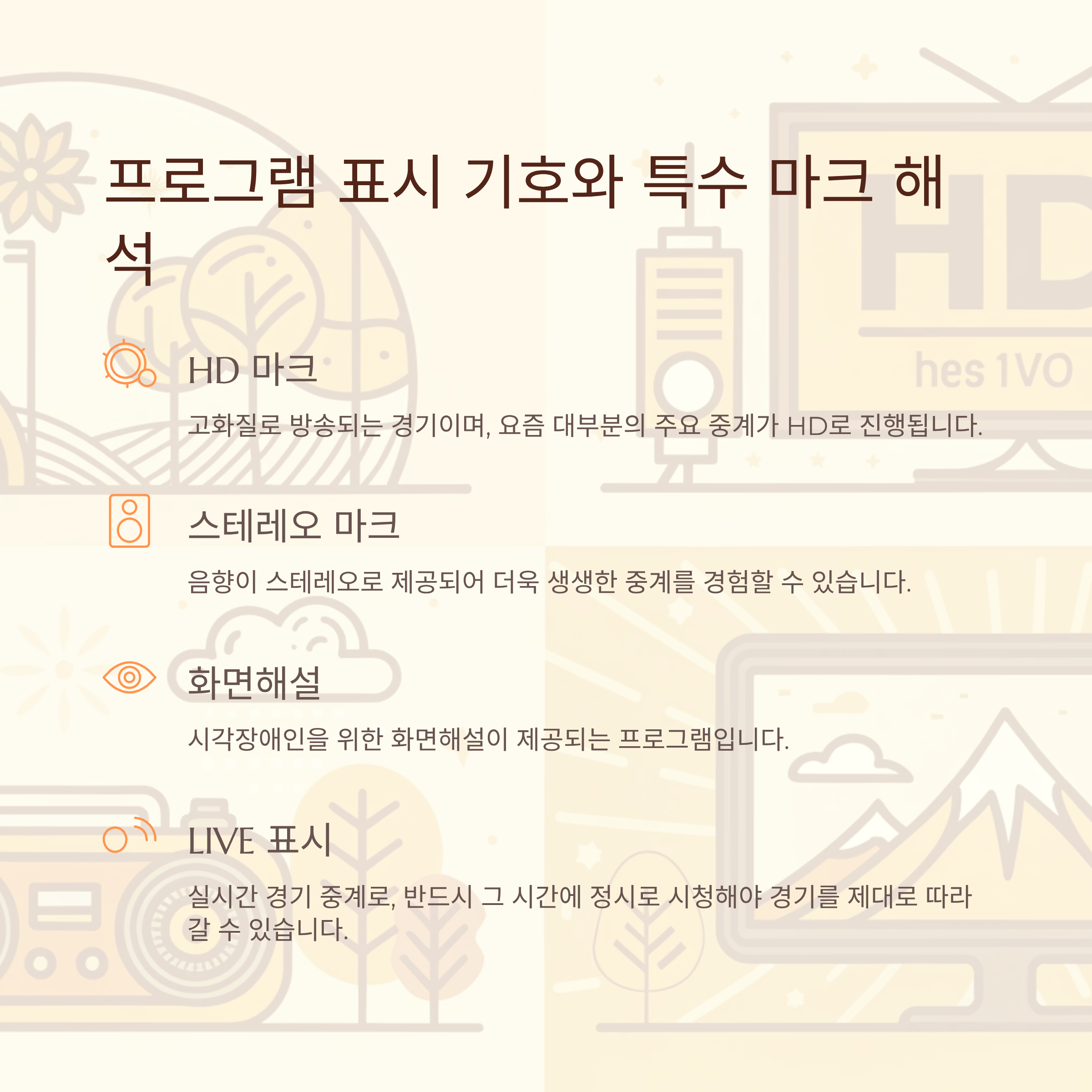 편성표에는 여러 기호들이 사용되는데, 이를 정확히 이해하면 원하는 프로그램을 더 쉽게 찾을 수 있습니다. HD 마크가 붙은 프로그램은 고화질로 방송되는 경기이며, 요즘 대부분의 주요 중계가 HD로 진행됩니다. 스테레오 마크는 음향이 스테레오로 제공된다는 의미이고, 화면해설 마크가 있으면 시각장애인을 위한 화면해설이 제공됩니다. 생방송을 의미하는 LIVE 표시는 실시간 경기 중계이며, 이 마크가 있으면 반드시 그 시간에 정시로 시청해야 경기를 제대로 따라갈 수 있습니다.