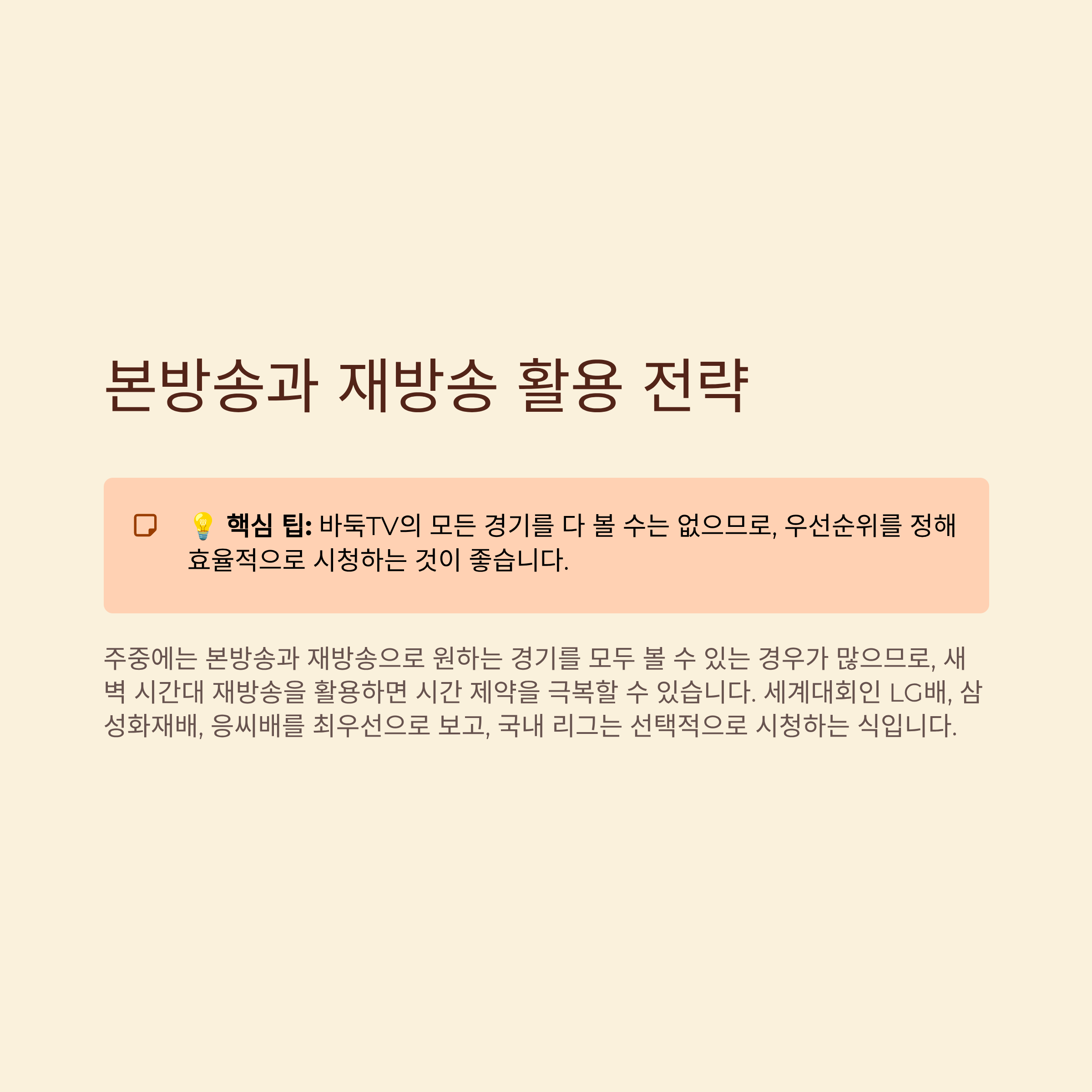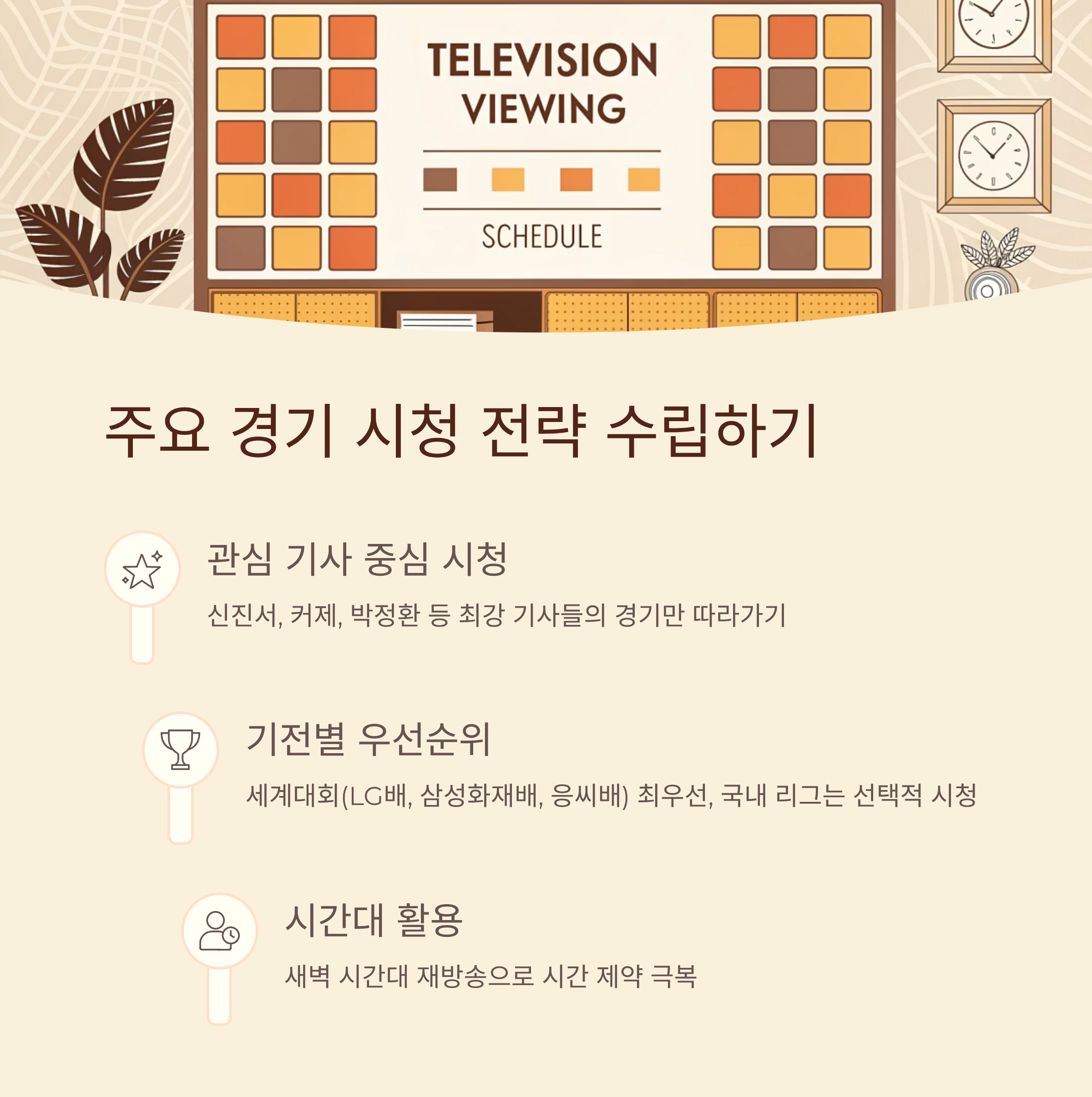 바둑TV의 모든 경기를 다 볼 수는 없으므로, 우선순위를 정해 효율적으로 시청하는 것이 좋습니다. 먼저 본인이 관심 있는 기사를 정해 그 기사의 경기만 따라가는 방법이 있습니다. 신진서, 커제, 박정환 등 최강 기사들의 경기는 보통 중계가 많이 되므로 쉽게 찾을 수 있습니다. 다음으로 기전별로 우선순위를 정하는 방법입니다. 세계대회인 LG배, 삼성화재배, 응씨배를 최우선으로 보고, 국내 리그는 선택적으로 시청하는 식입니다. 마지막으로 주중에는 본방송과 재방송으로 원하는 경기를 모두 볼 수 있는 경우가 많으므로, 새벽 시간대 재방송을 활용하면 시간 제약을 극복할 수 있습니다.