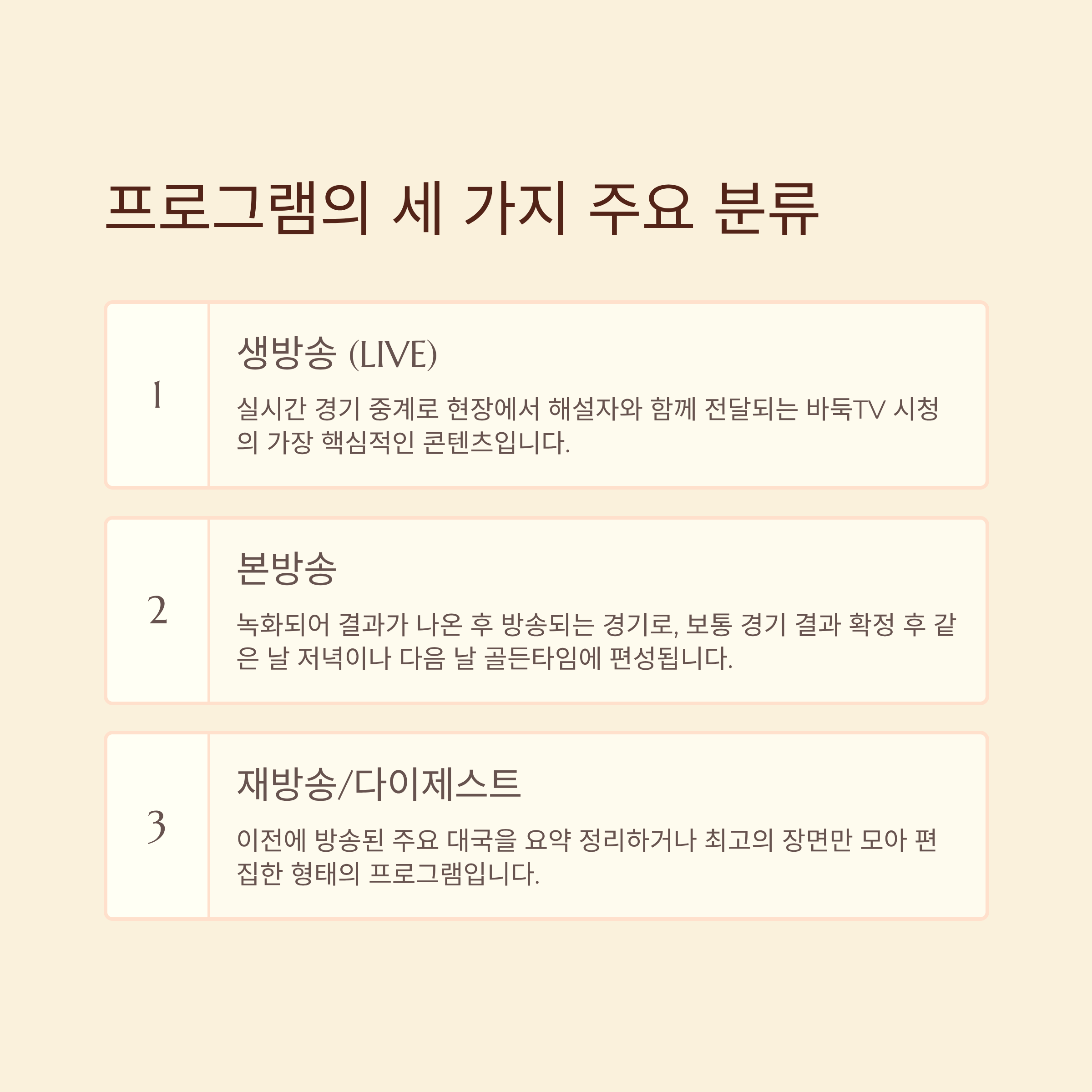 바둑TV의 모든 프로그램은 크게 세 가지로 분류됩니다. 첫째는 생방송(LIVE)으로 표시되는 실시간 경기 중계입니다. 이는 대국이 진행되는 그 시간에 현장에서 해설자와 함께 전달되는 프로그램으로, 바둑TV 시청의 가장 핵심적인 콘텐츠입니다. 둘째는 본방송으로 녹화되어 결과가 나온 후 방송되는 경기입니다. 본방송은 보통 경기 결과가 확정된 후 같은 날 저녁이나 다음 날 골든타임에 편성되며, 높은 시청률을 기록하는 프로그램들이 주를 이룹니다. 셋째는 재방송과 다이제스트 프로그램으로, 이전에 방송된 주요 대국을 요약 정리하거나 최고의 장면만 모아 편집한 형태입니다.