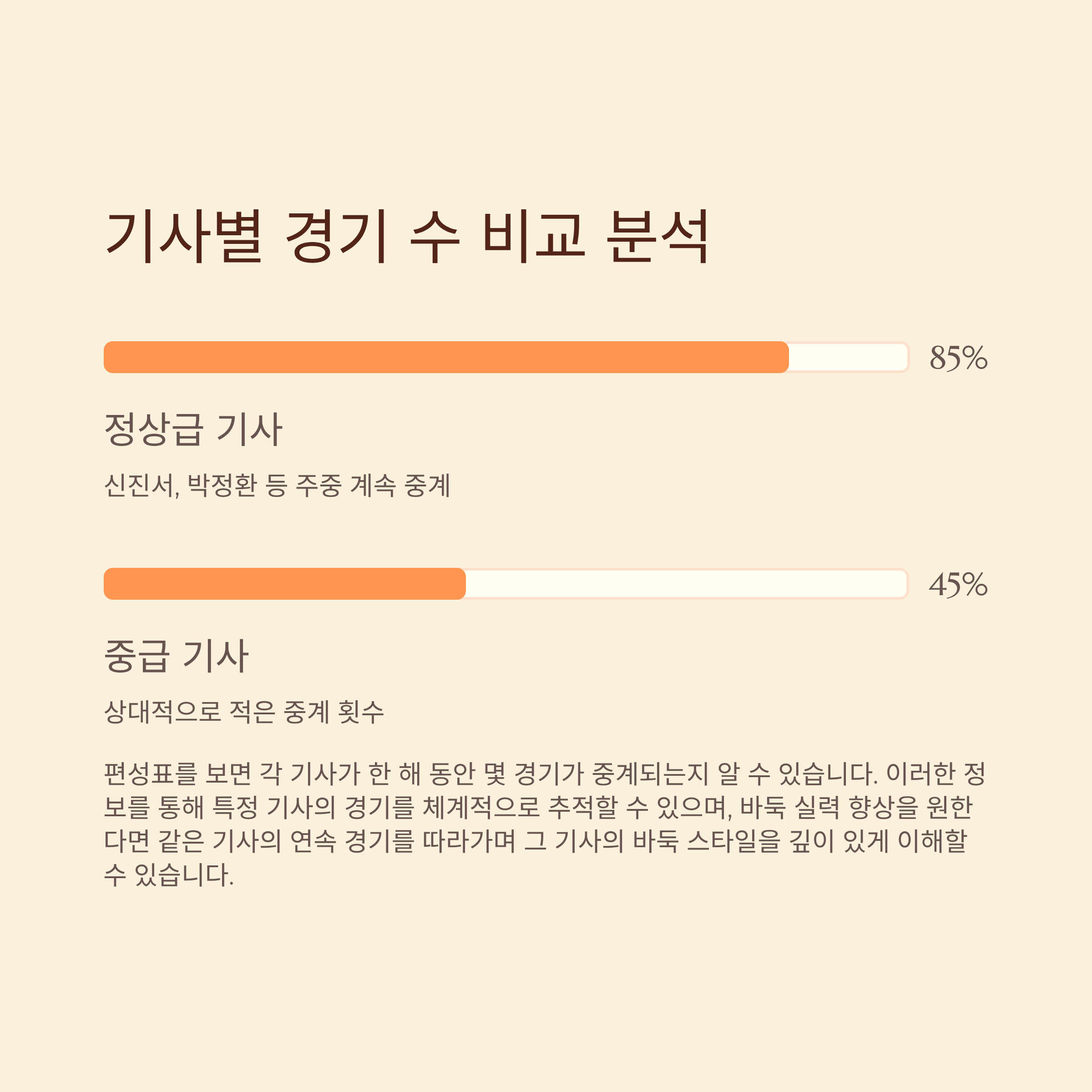 편성표를 보면 각 기사가 한 해 동안 몇 경기가 중계되는지 알 수 있습니다. 신진서나 박정환 같은 정상급 기사는 주중에 계속 경기가 중계되는 반면, 중급 기사들의 경기는 상대적으로 적은 횟수로 중계됩니다. 이러한 정보를 통해 특정 기사의 경기를 체계적으로 추적할 수 있으며, 바둑 실력 향상을 원한다면 같은 기사의 연속 경기를 따라가며 그 기사의 바둑 스타일을 깊이 있게 이해할 수 있습니다.