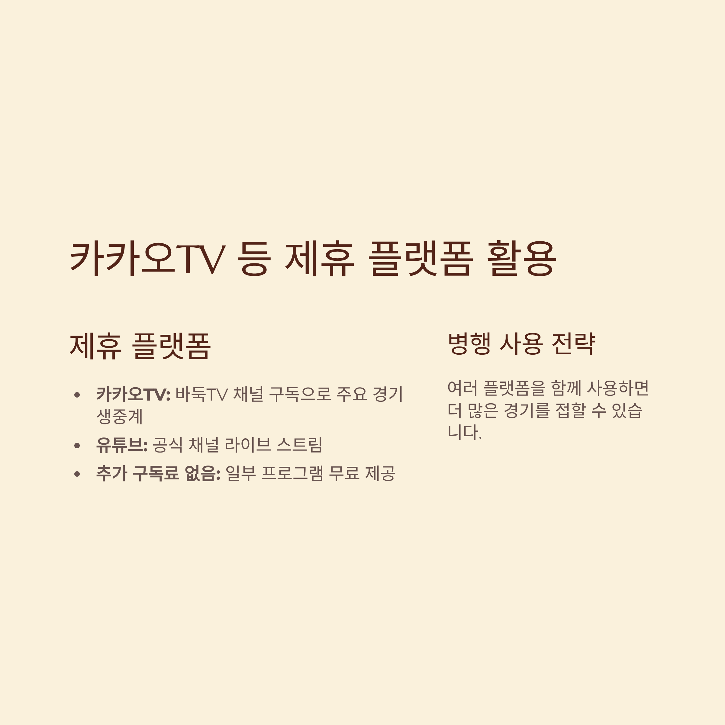 바둑TV는 카카오TV, 유튜브 등 여러 플랫폼과 제휴하여 생중계를 제공합니다. 카카오TV에서도 바둑TV 채널을 구독하면 주요 경기의 생중계를 시청할 수 있으며, 유튜브에서도 바둑TV 공식 채널의 라이브 스트림을 통해 경기를 볼 수 있습니다. 이러한 제휴 플랫폼은 추가 구독료 없이 일부 프로그램을 제공하므로, 여러 플랫폼을 병행 사용하면 더 많은 경기를 접할 수 있습니다.