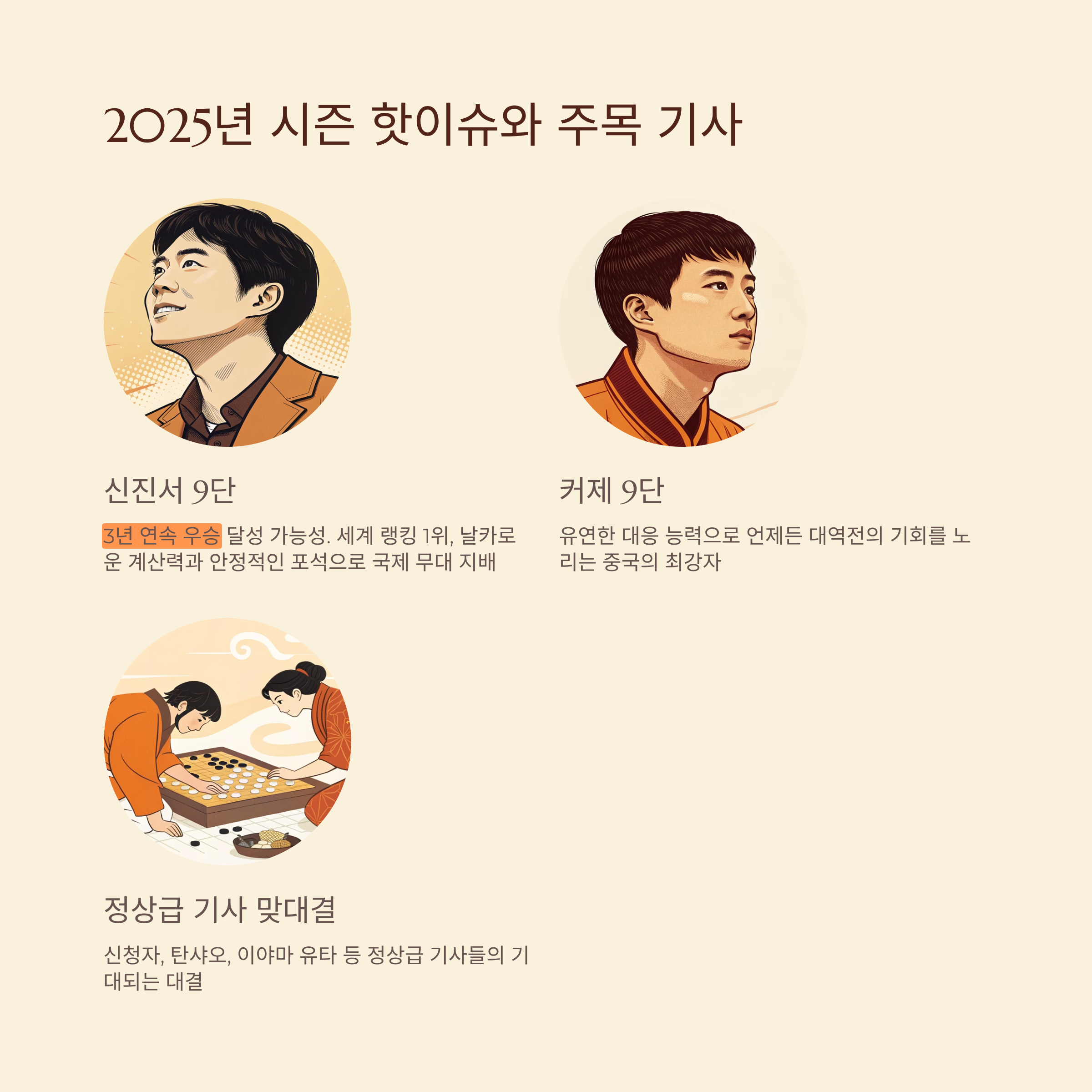 2025년 바둑계의 최대 핫이슈는 신진서 9단의 3년 연속 우승 달성 가능성입니다. 현재 세계 랭킹 1위를 고수 중인 신진서는 날카로운 계산력과 안정적인 포석으로 국제 무대를 지배하고 있습니다. 반면 중국의 커제 9단은 유연한 대응 능력으로 언제든 대역전의 기회를 노리고 있습니다. 또한 한국의 신청자, 중국의 탄샤오, 일본의 이야마 유타 등 정상급 기사들의 맞대결도 매우 기대되는 포인트입니다.