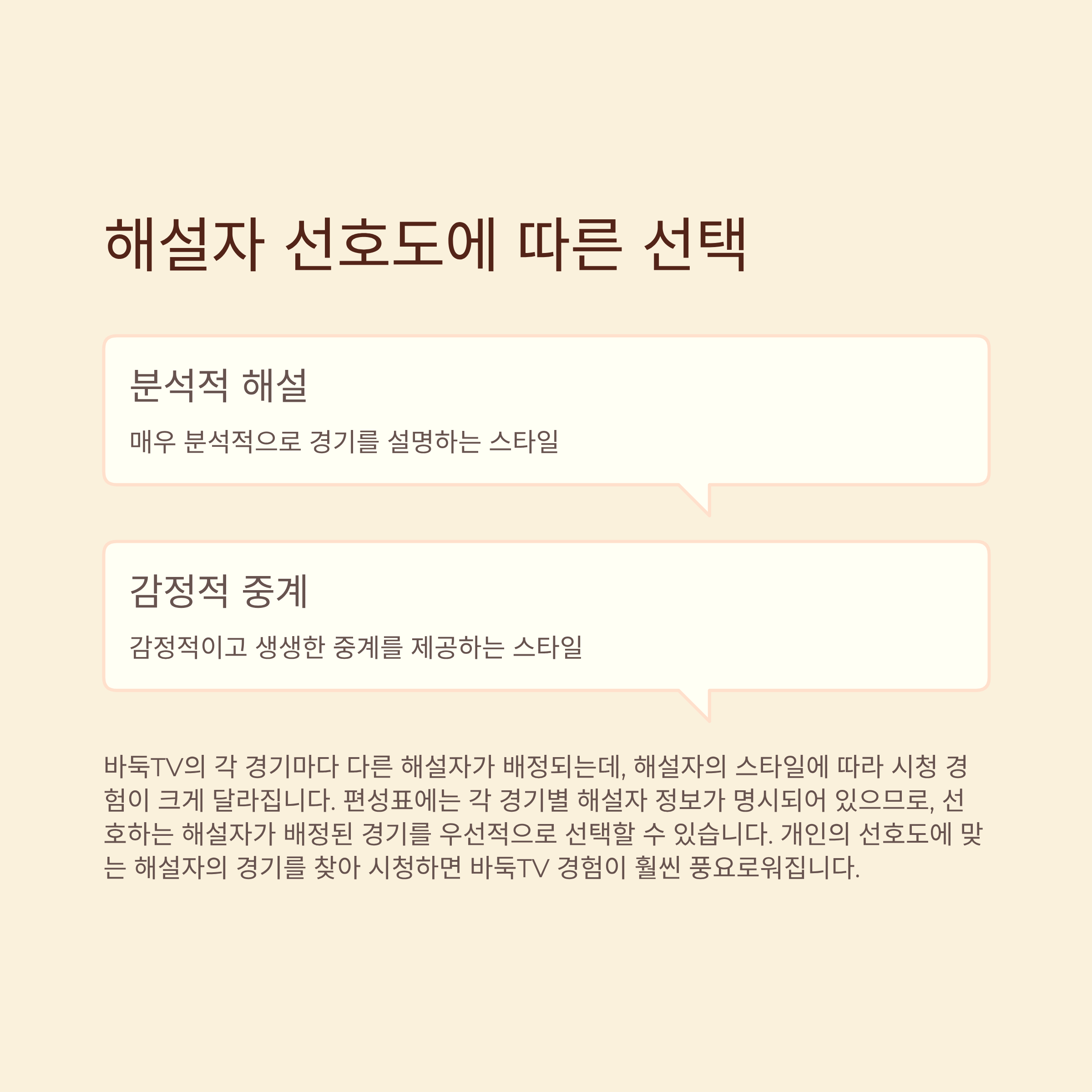 바둑TV의 각 경기마다 다른 해설자가 배정되는데, 해설자의 스타일에 따라 시청 경험이 크게 달라집니다. 어떤 해설자는 매우 분석적으로 경기를 설명하고, 어떤 해설자는 감정적이고 생생한 중계를 제공합니다. 개인의 선호도에 맞는 해설자의 경기를 찾아 시청하면 바둑TV 경험이 훨씬 풍요로워집니다. 편성표에는 각 경기별 해설자 정보가 명시되어 있으므로, 선호하는 해설자가 배정된 경기를 우선적으로 선택할 수 있습니다.