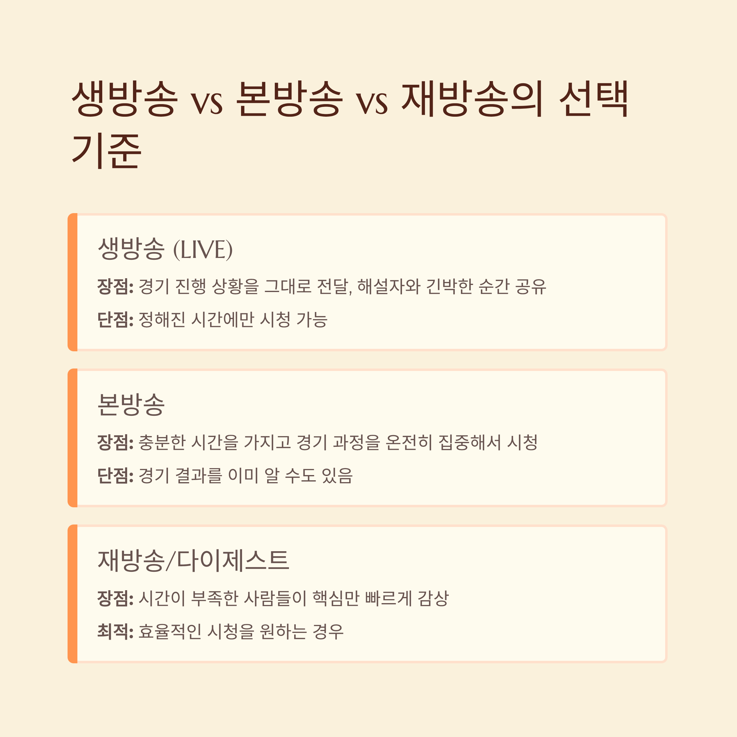 실시간으로 경기를 따라가고 싶다면 생방송을 선택해야 합니다. 생방송은 경기가 진행되는 상황을 그대로 전달하므로, 해설자와 함께 긴박한 순간을 공유할 수 있습니다. 다만 생방송은 정해진 시간에만 볼 수 있으므로, 시간 맞추기가 어려운 사람들은 본방송을 이용하는 것이 좋습니다. 본방송은 경기 결과가 나온 후 편성되므로 승패를 이미 알 수도 있지만, 충분한 시간을 가지고 경기 과정을 온전히 집중해서 볼 수 있습니다. 재방송과 다이제스트는 시간이 부족한 사람들이 핵심만 빠르게 감상하기에 최적입니다.