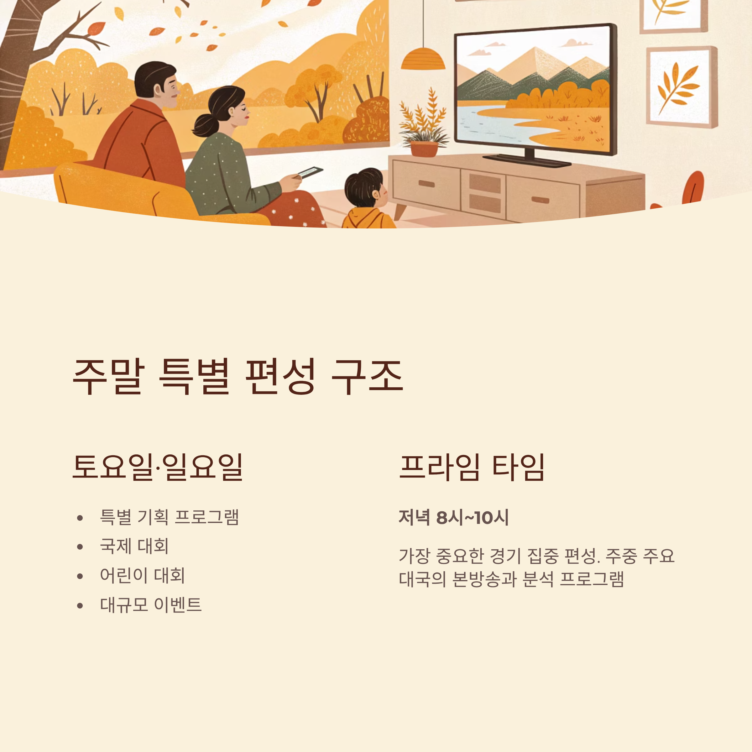 주말 편성은 평일과 완전히 다른 구조를 가집니다. 토요일과 일요일에는 특별 기획 프로그램이나 국제 대회, 어린이 대회 같은 대규모 이벤트가 편성되는 경향이 있습니다. 주말 오전은 어린이와 초급자를 위한 바둑 교육 프로그램이 주를 이루며, 주말 오후와 저녁은 주중에 진행된 주요 대국의 본방송과 분석 프로그램이 집중됩니다. 특히 주말 저녁 8시부터 10시까지는 시청자들이 많이 시청하는 프라임 타임으로, 가장 중요한 경기들이 이 시간대에 편성됩니다.