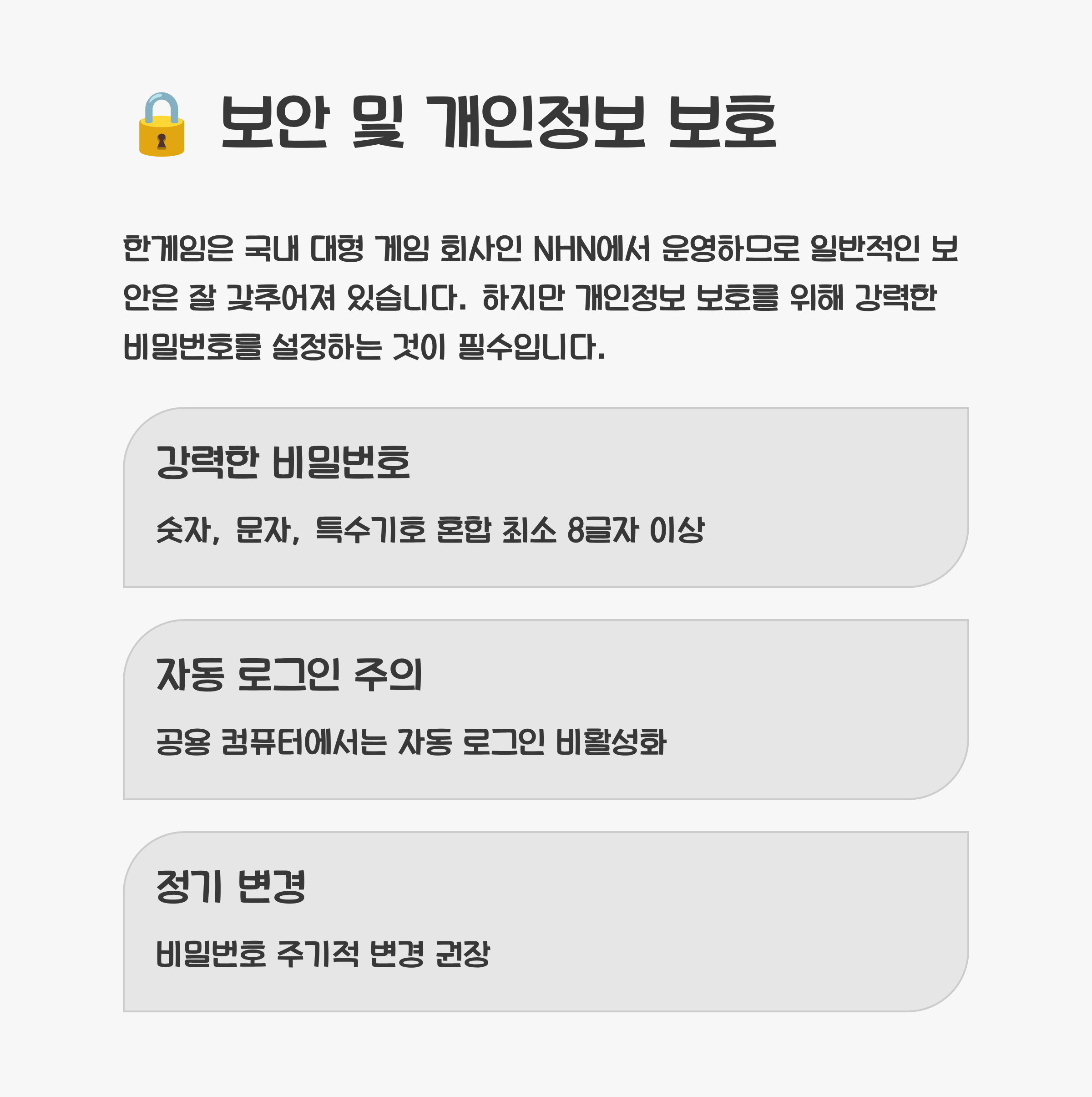 한게임은 국내 대형 게임 회사인 NHN에서 운영하므로 일반적인 보안은 잘 갖추어져 있습니다. 하지만 개인정보 보호를 위해 강력한 비밀번호를 설정하는 것이 필수입니다. 비밀번호는 숫자, 문자, 특수 기호를 혼합하여 최소 8글자 이상으로 설정하는 것이 좋습니다.