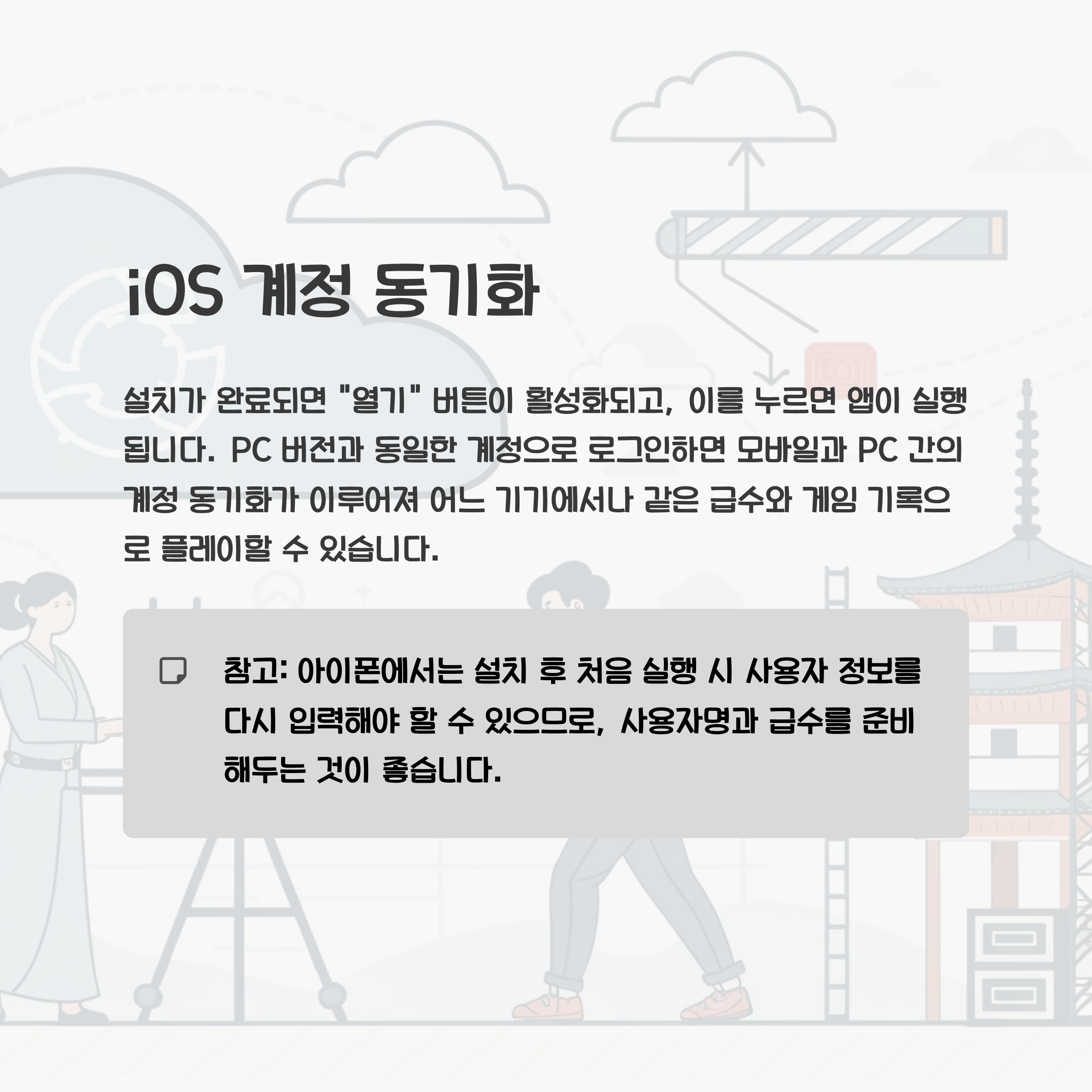 설치가 완료되면 "열기" 버튼이 활성화되고, 이를 누르면 앱이 실행됩니다. PC 버전과 동일한 계정으로 로그인하면 모바일과 PC 간의 계정 동기화가 이루어져 어느 기기에서나 같은 급수와 게임 기록으로 플레이할 수 있습니다. 아이폰에서는 설치 후 처음 실행 시 사용자 정보를 다시 입력해야 할 수 있으므로, 사용자명과 급수를 준비해두는 것이 좋습니다.