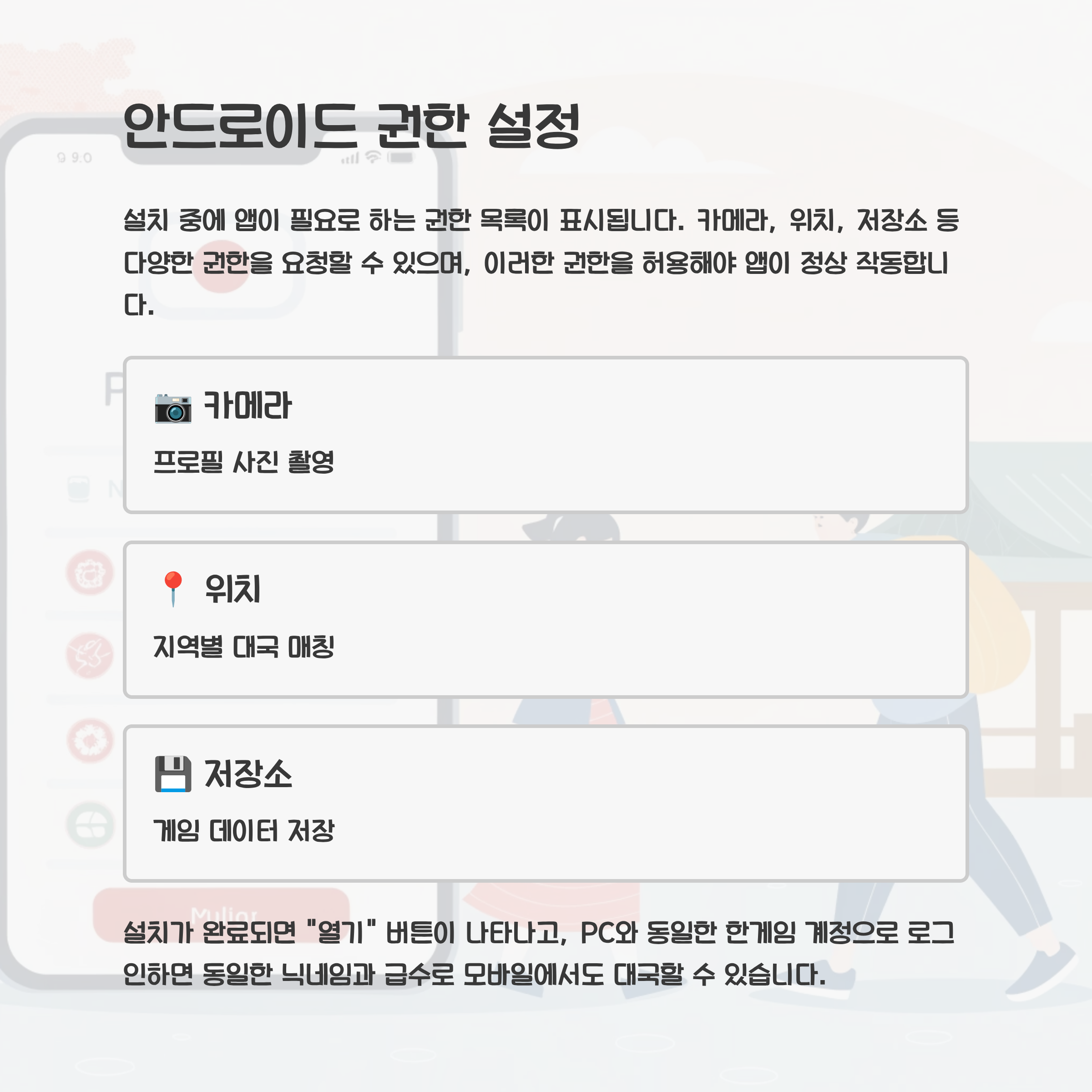 설치 중에 앱이 필요로 하는 권한 목록이 표시됩니다. 카메라, 위치, 저장소 등 다양한 권한을 요청할 수 있으며, 이러한 권한을 허용해야 앱이 정상 작동합니다. 설치가 완료되면 "열기" 버튼이 나타나고, 이를 클릭하면 앱이 실행됩니다. 처음 실행 시에는 PC와 동일한 한게임 계정으로 로그인하면, 동일한 닉네임과 급수로 모바일에서도 대국할 수 있습니다.