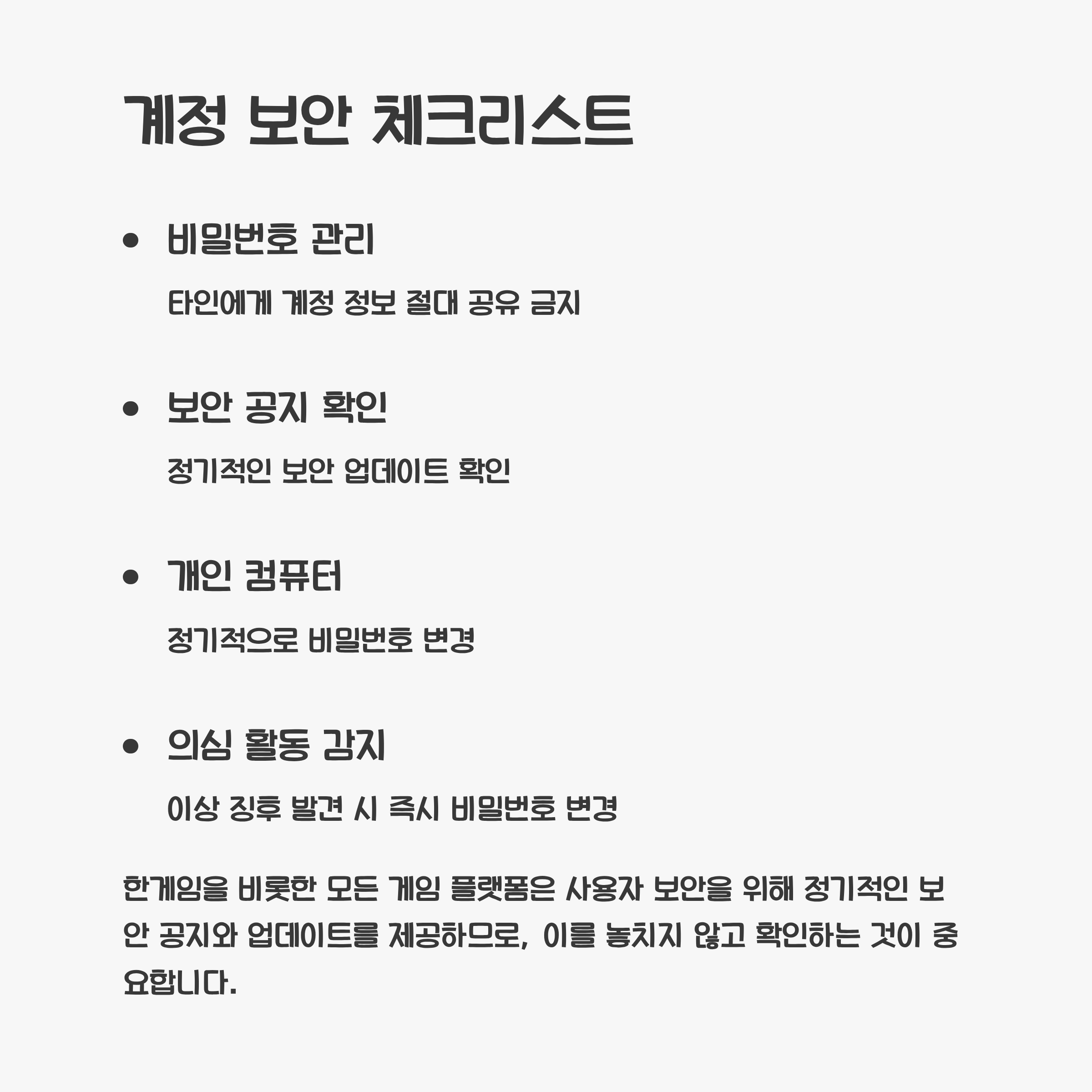 또한 공용 컴퓨터에서 한게임을 이용할 때는 자동 로그인 기능을 활성화하지 않도록 주의해야 합니다. 개인 컴퓨터에서도 정기적으로 비밀번호를 변경하고, 타인에게 계정 정보를 절대 공유하지 않아야 합니다. 한게임을 비롯한 모든 게임 플랫폼은 사용자 보안을 위해 정기적인 보안 공지와 업데이트를 제공하므로, 이를 놓치지 않고 확인하는 것이 중요합니다.