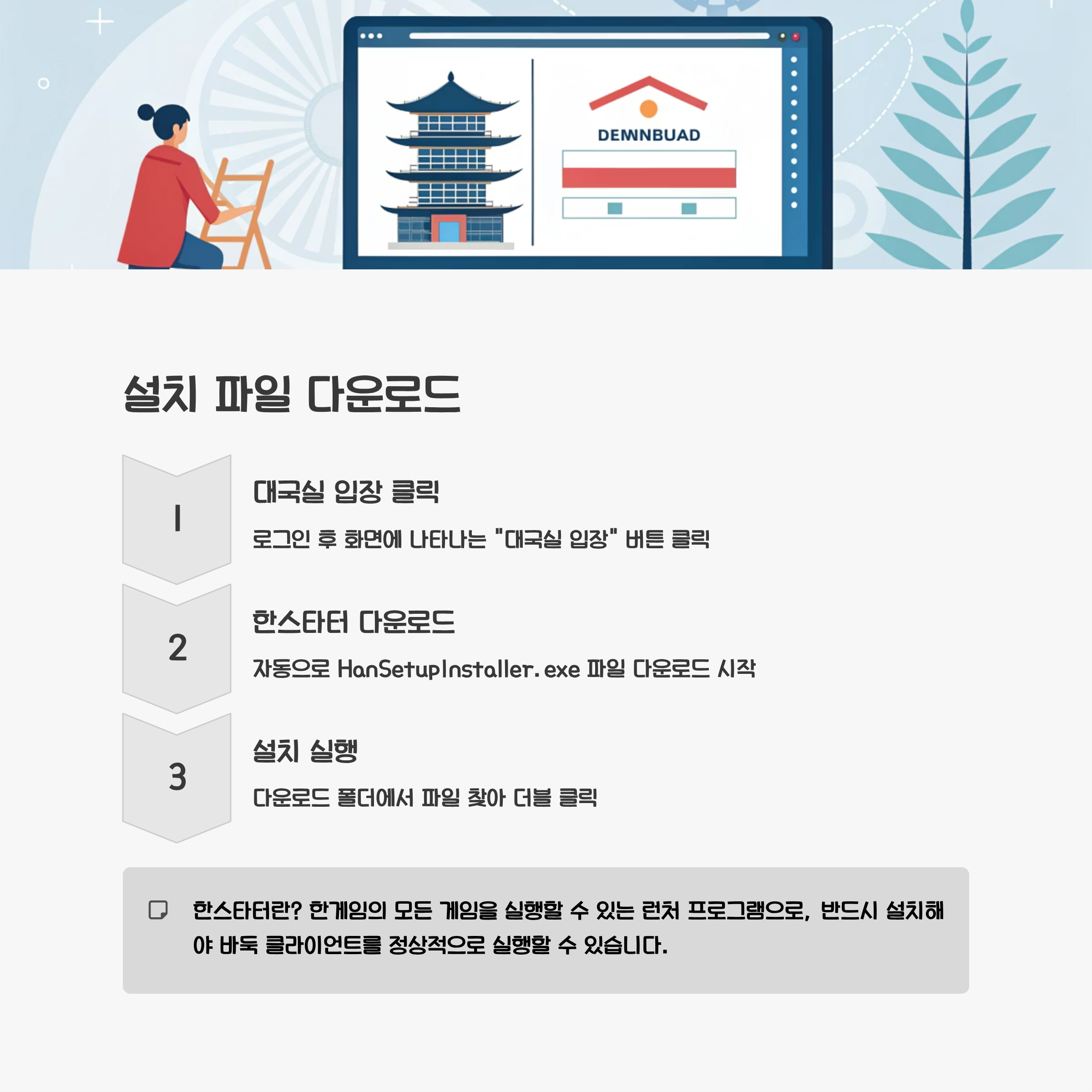 회원가입이나 로그인을 마치면 화면에 "대국실 입장" 버튼이 나타납니다. 이 버튼을 클릭하면 자동으로 한스타터 설치 파일이 다운로드되기 시작합니다. 한스타터는 한게임의 모든 게임을 실행할 수 있는 런처 프로그램으로, 반드시 설치해야 바둑 클라이언트를 정상적으로 실행할 수 있습니다. 다운로드 폴더에서 HanSetupInstaller.exe 파일을 찾아 더블 클릭하여 설치를 진행합니다.