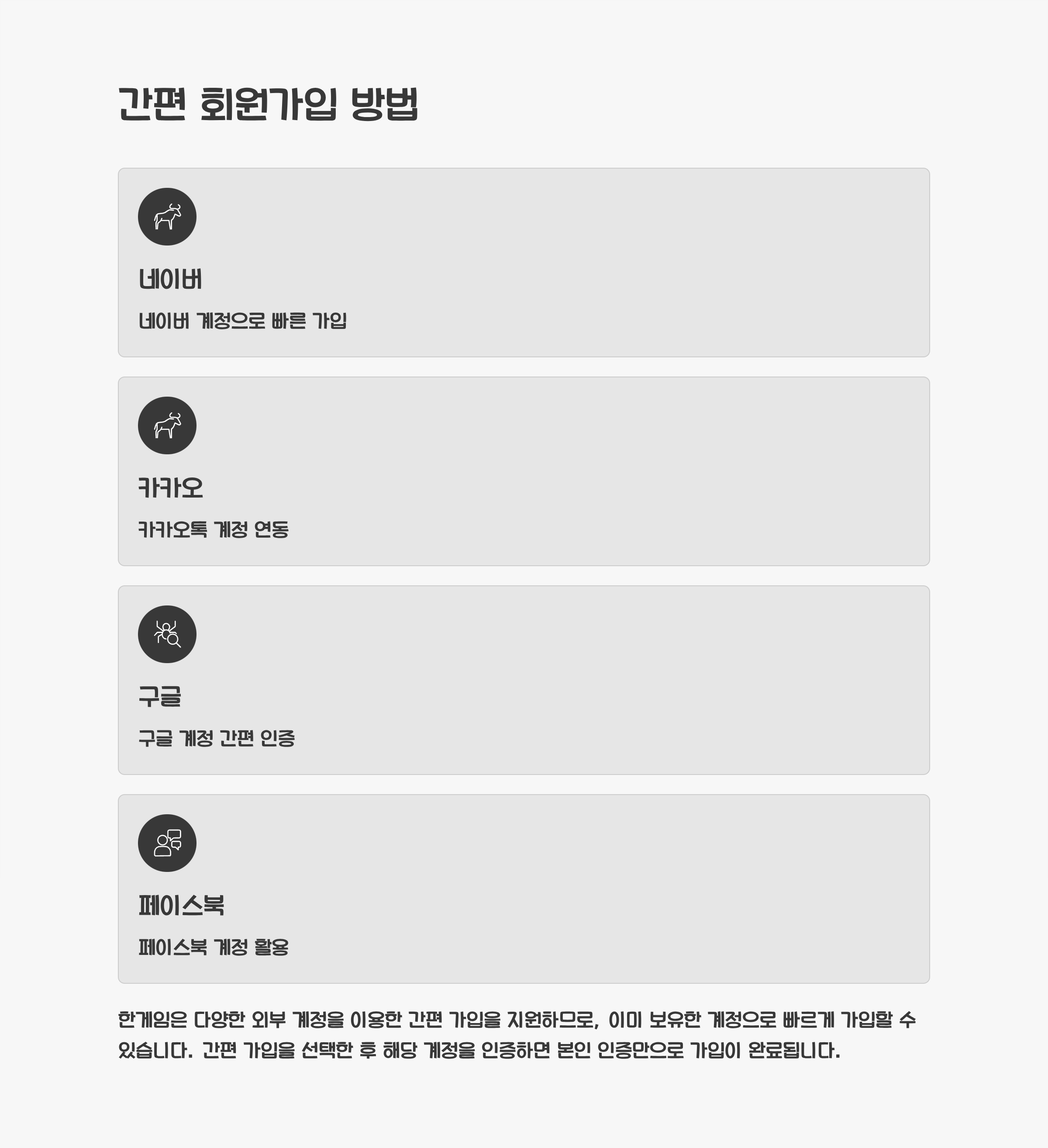 홈페이지에 접속하면 우측 상단에 로그인 버튼이 보입니다. 기존 한게임 계정이 있다면 직접 로그인하면 되고, 없다면 회원가입을 진행합니다. 한게임은 네이버, 카카오, 구글, 페이스북 등 다양한 외부 계정을 이용한 간편 가입을 지원하므로, 이미 보유한 계정으로 빠르게 가입할 수 있습니다. 간편 가입을 선택한 후 해당 계정을 인증하면 본인 인증만으로 가입이 완료됩니다.