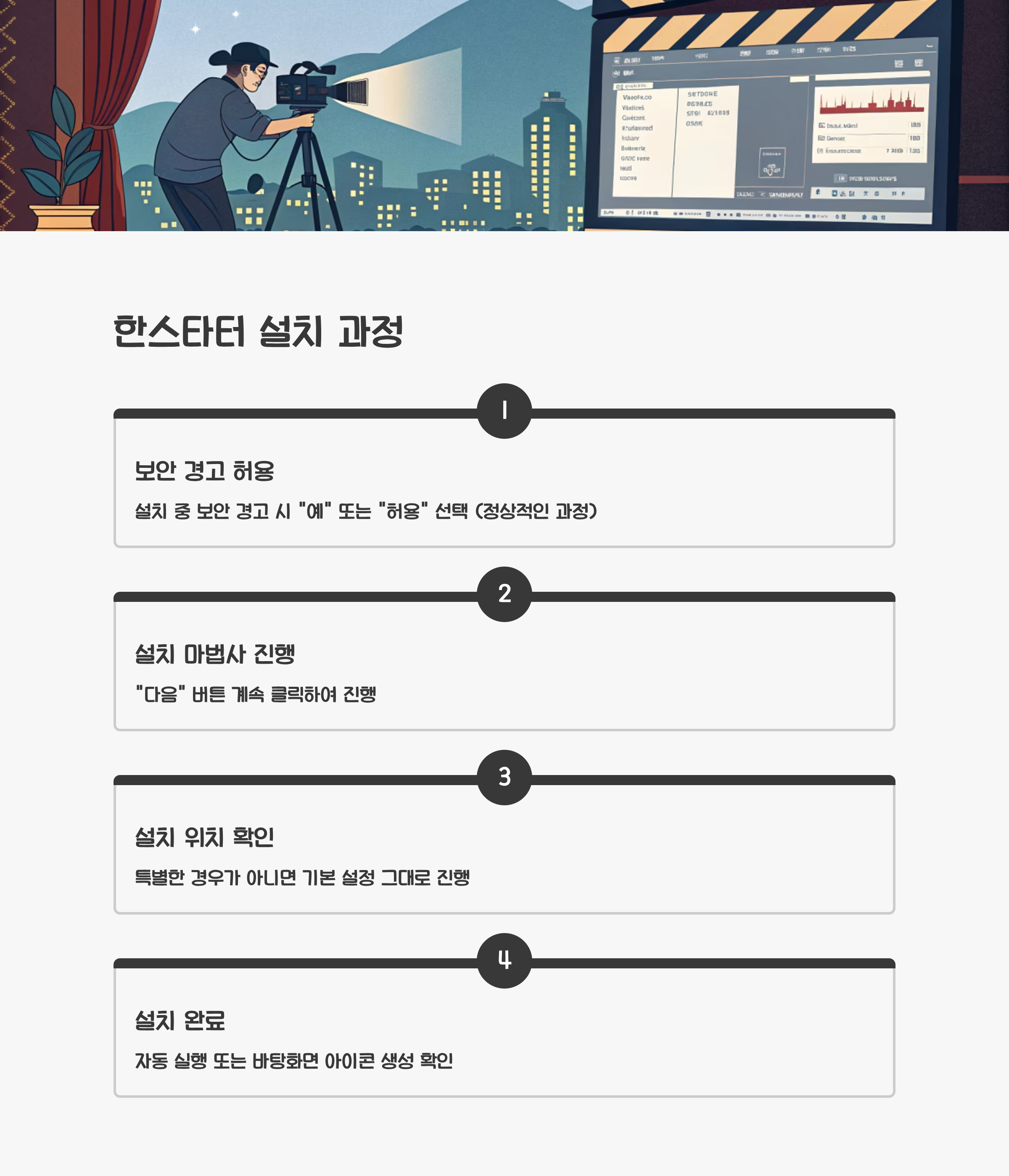 설치 과정 중 보안 경고가 뜨면 "예" 또는 "허용"을 선택하여 진행합니다. 이 경고는 정상적인 것이므로 걱정할 필요가 없습니다. 설치 마법사의 안내에 따라 "다음" 버튼을 계속 클릭하고, 설치 위치를 특별히 변경할 필요가 없다면 기본 설정 그대로 진행하면 됩니다. 설치가 완료되면 자동으로 한스타터가 실행되거나 바탕화면에 아이콘이 생성됩니다.