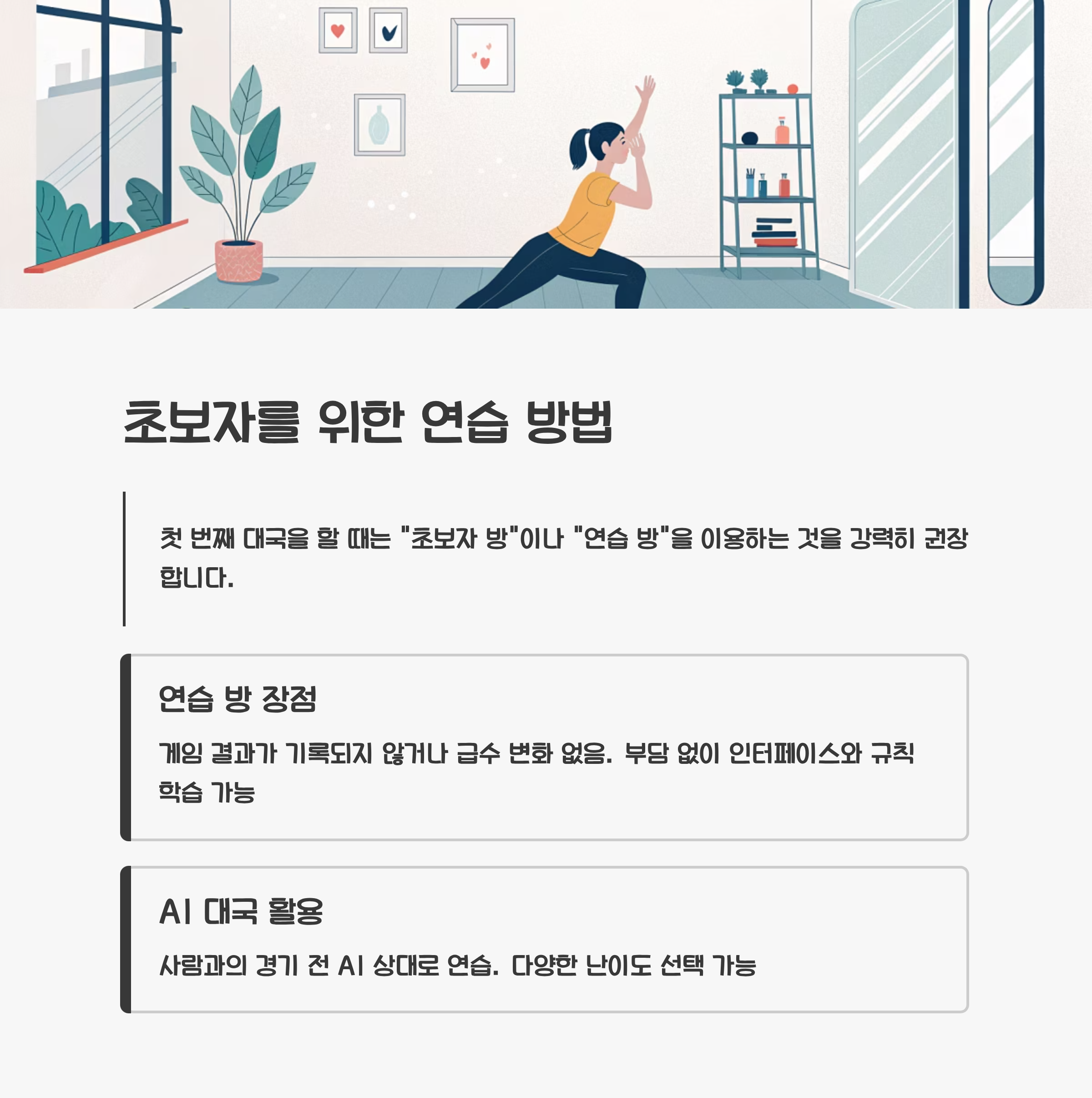 첫 번째 대국을 할 때는 "초보자 방"이나 "연습 방"을 이용하는 것을 강력히 권장합니다. 이곳에서는 게임 결과가 기록되지 않거나 급수 변화가 없으므로, 부담 없이 게임 인터페이스와 규칙을 익힐 수 있습니다. 또한 한게임은 AI 대국 기능도 제공하므로, 사람과의 경기에 앞서 AI 상대로 몇 판을 연습하는 것도 좋은 방법입니다.