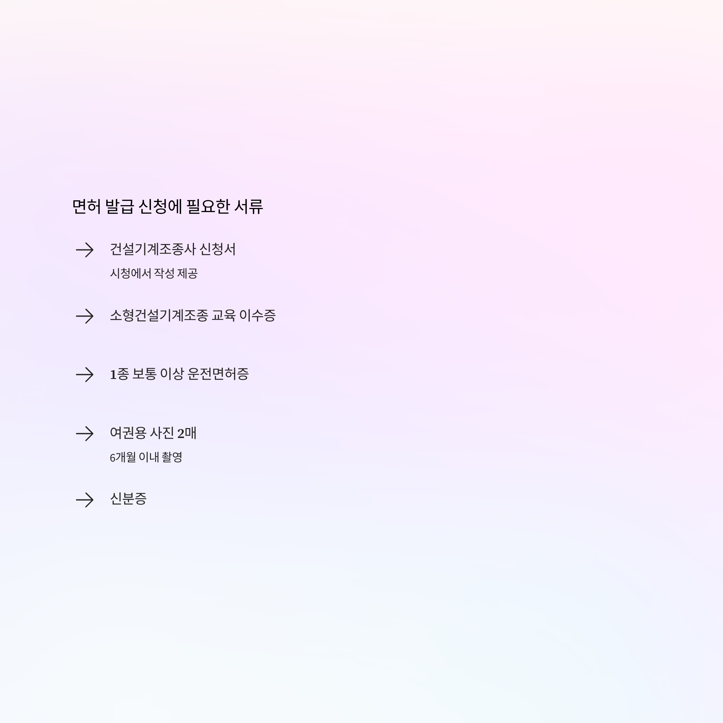 건설기계조종사 신청서(시청에서 작성 제공), 소형건설기계조종 교육 이수증, 1종 보통 이상 운전면허증, 6개월 이내 촬영한 여권용 사진 2매, 신분증이 필요합니다.