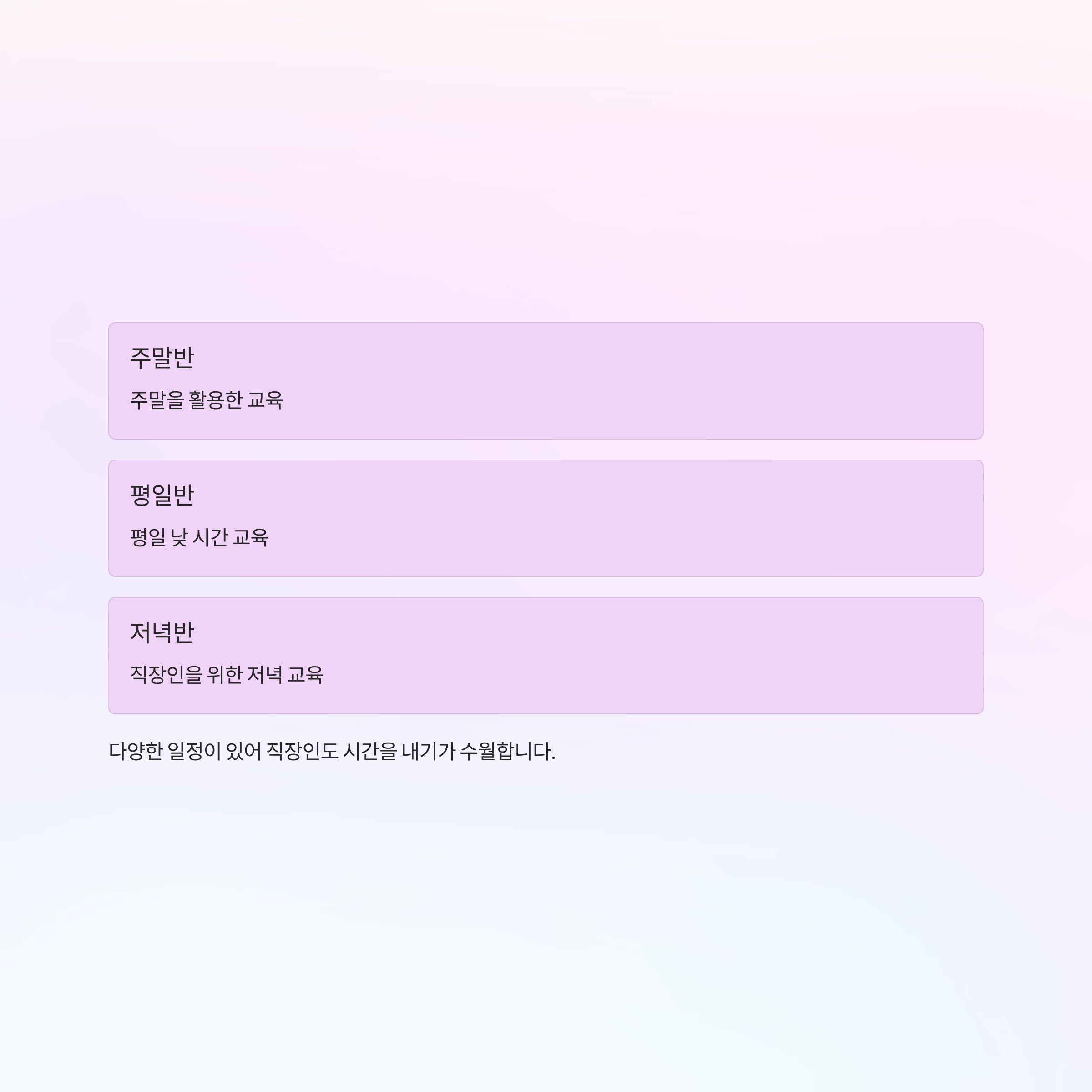 주말반, 평일반, 저녁반 등 다양한 일정이 있어 직장인도 시간을 내기가 수월합니다.