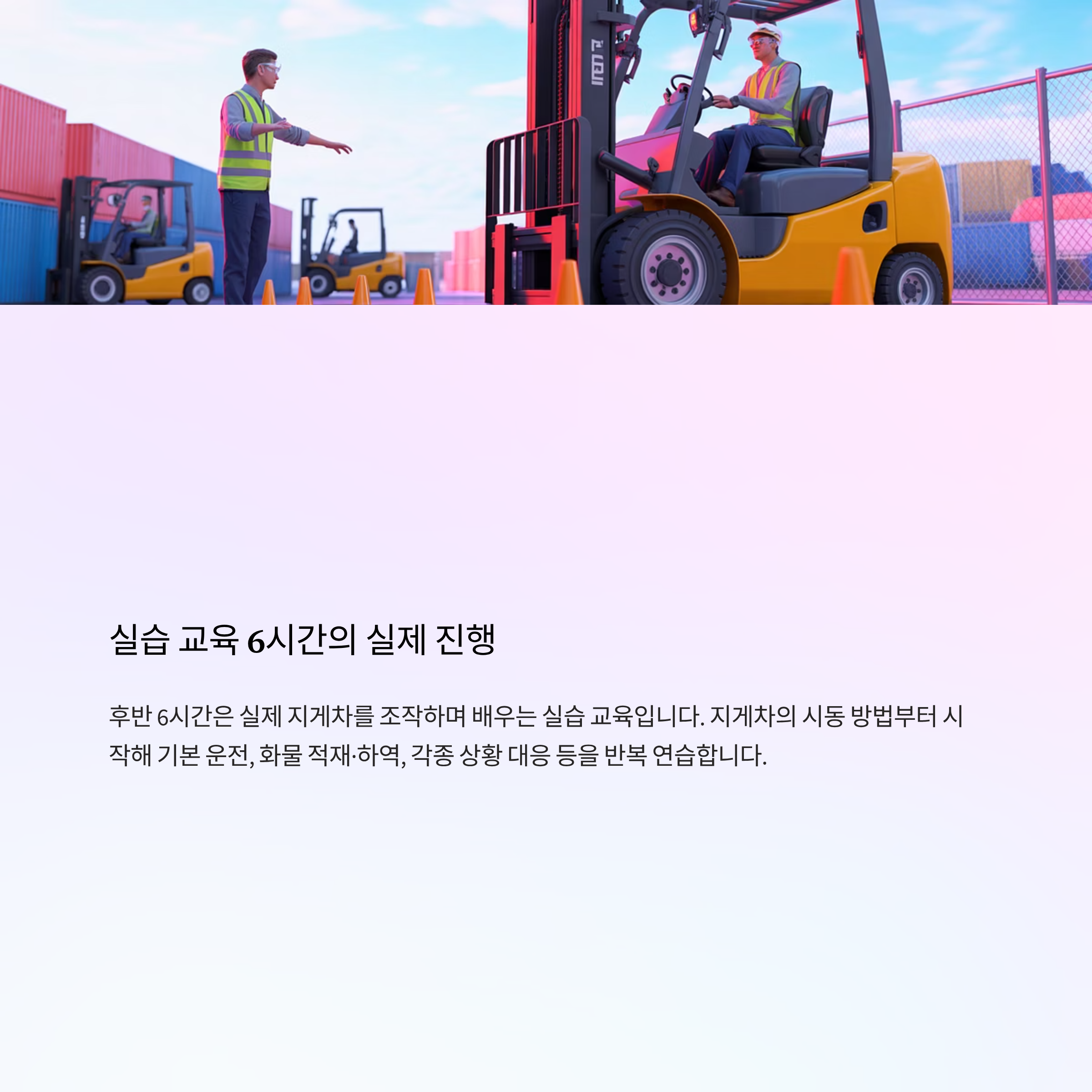 후반 6시간은 실제 지게차를 조작하며 배우는 실습 교육입니다.
