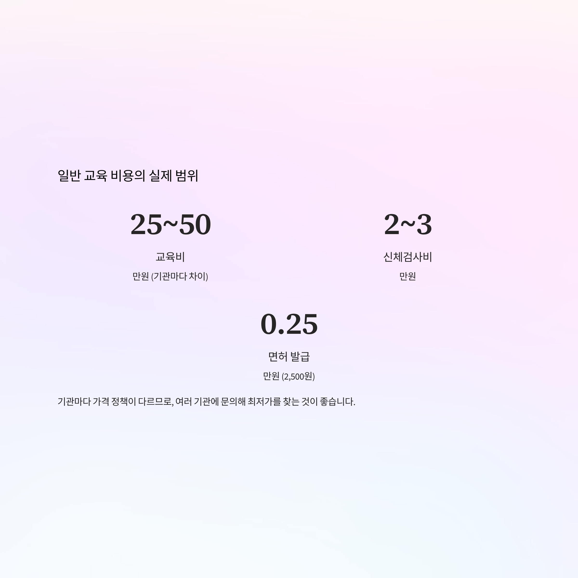 여기에 신체검사비(2~3만원)와 면허 발급 수수료(2,500원)가 별도로 발생하므로 총 비용을 미리 계산해야 합니다.