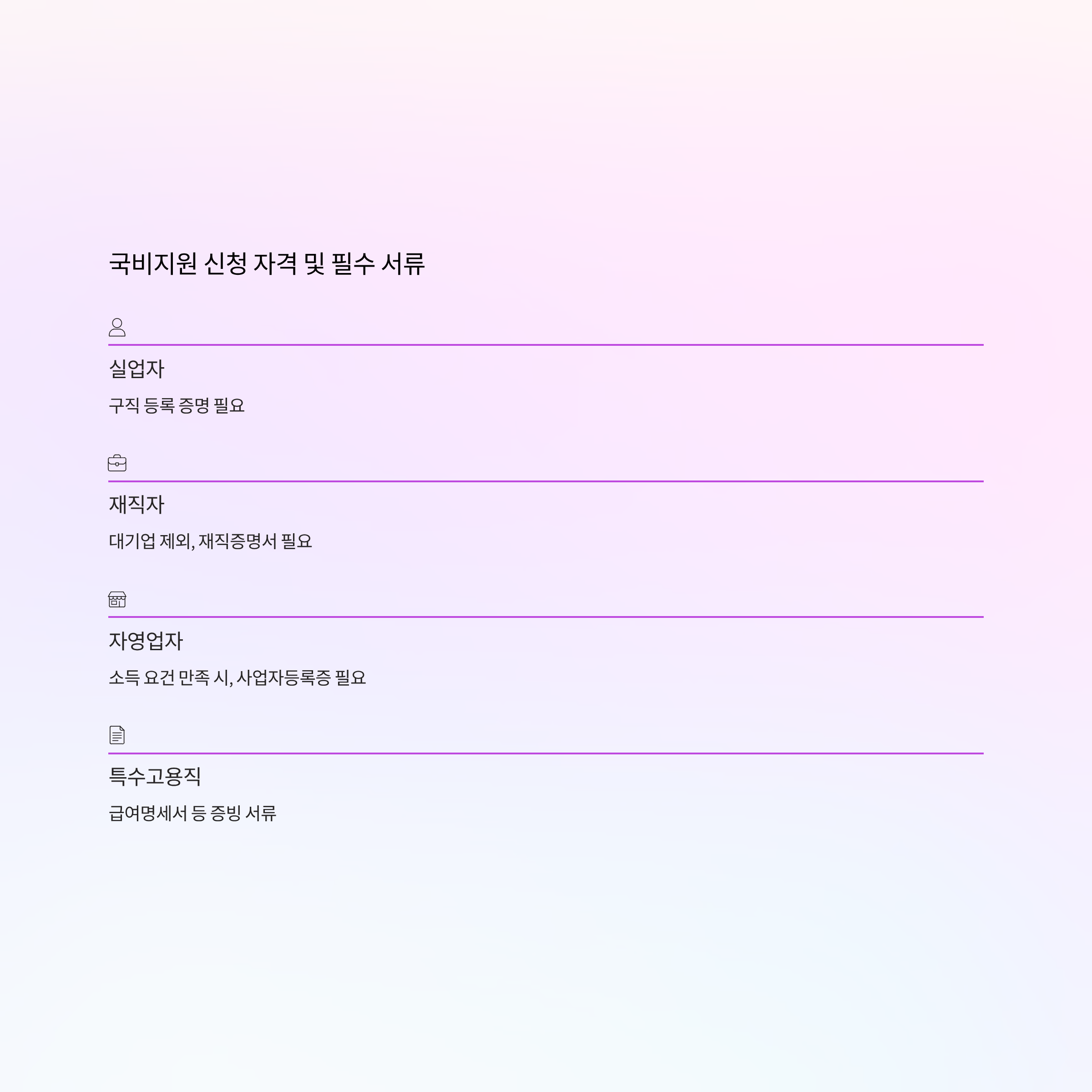 각 신분별로 제출해야 할 서류가 다른데, 구직 등록 증명, 사업자 등록증, 재직증명서, 급여명세서 등을 준비해야 합니다.