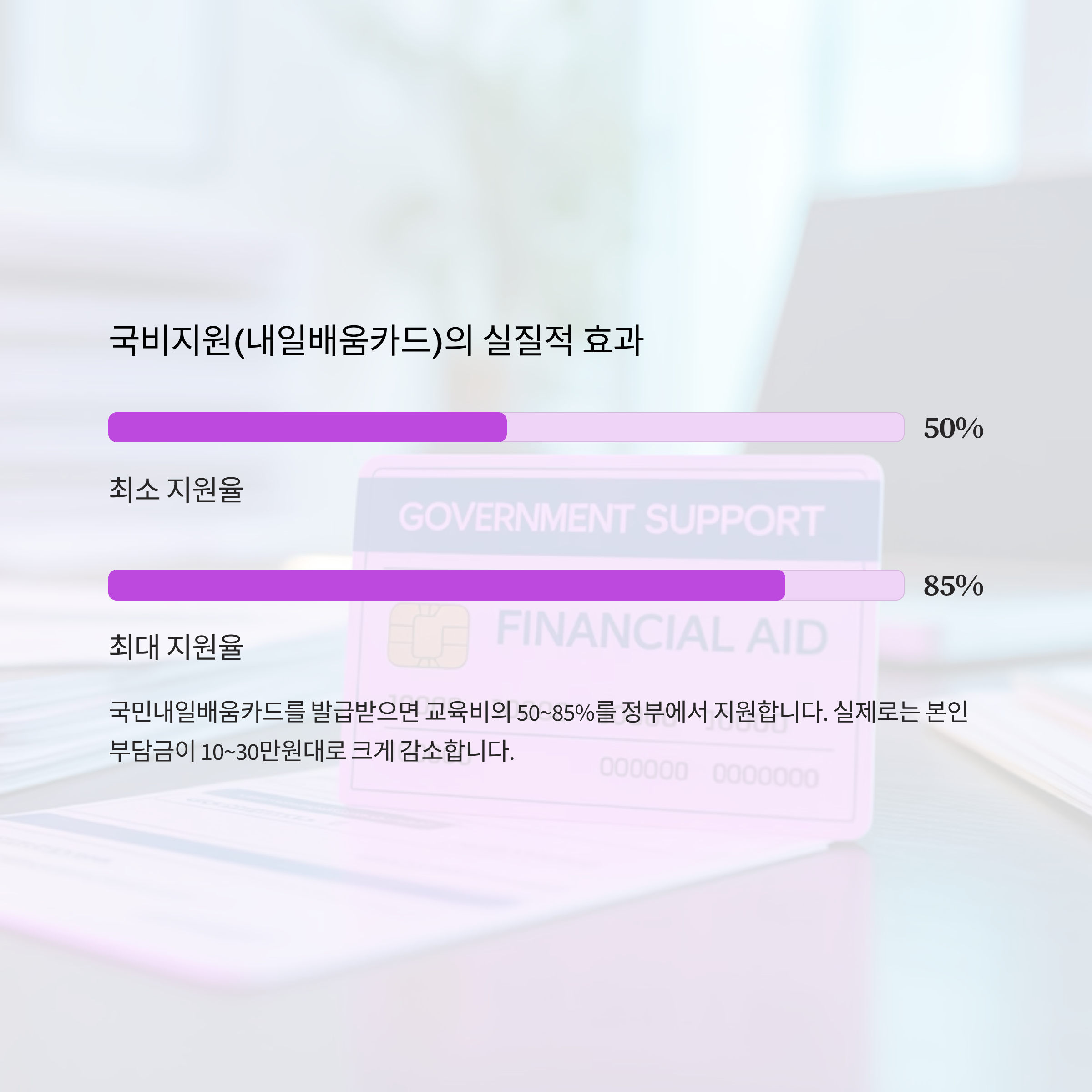 국민내일배움카드를 발급받으면 교육비의 50~85%를 정부에서 지원합니다.
