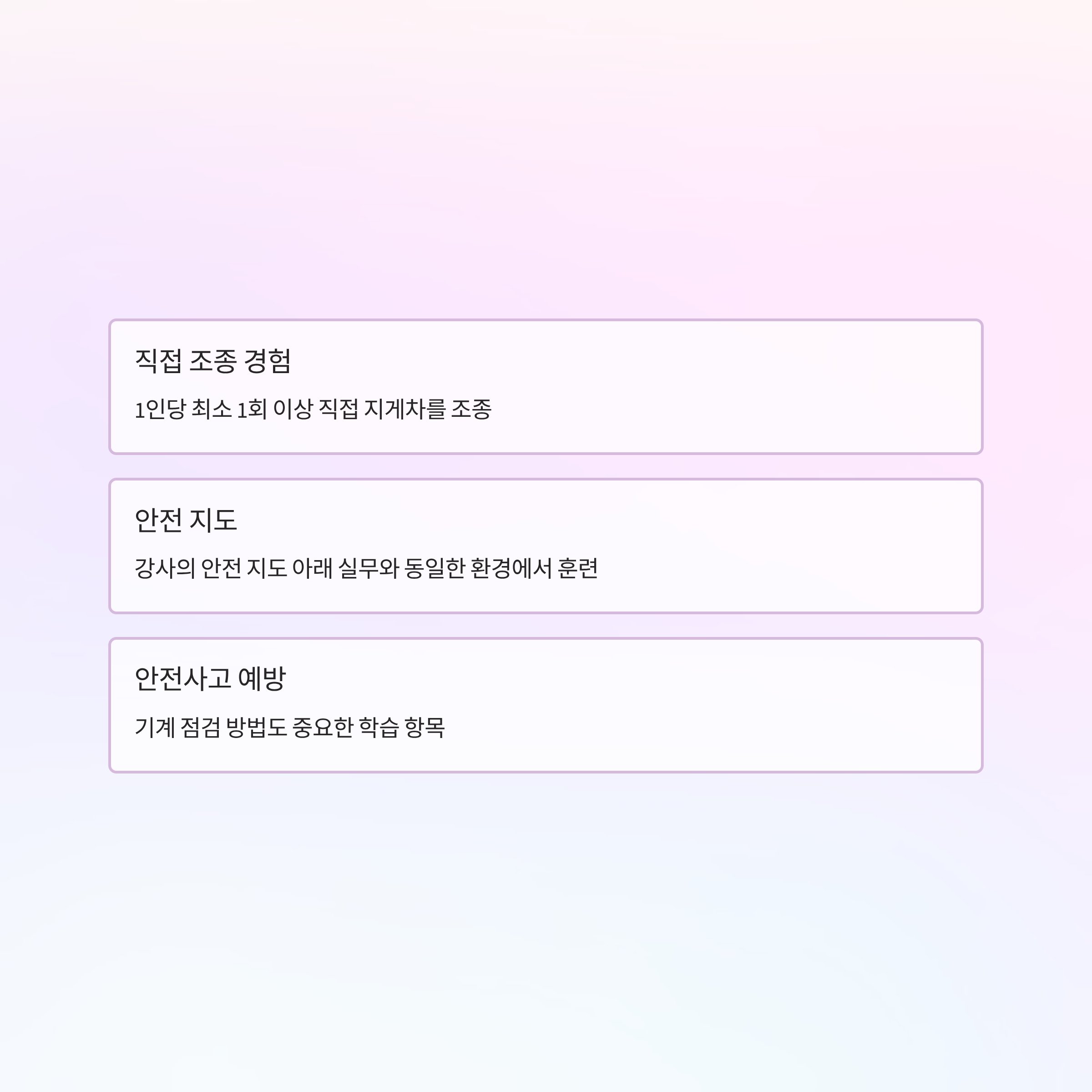 1인당 최소 1회 이상 직접 지게차를 조종해 보게 되며, 강사의 안전 지도 아래 실무와 동일한 환경에서 훈련합니다.