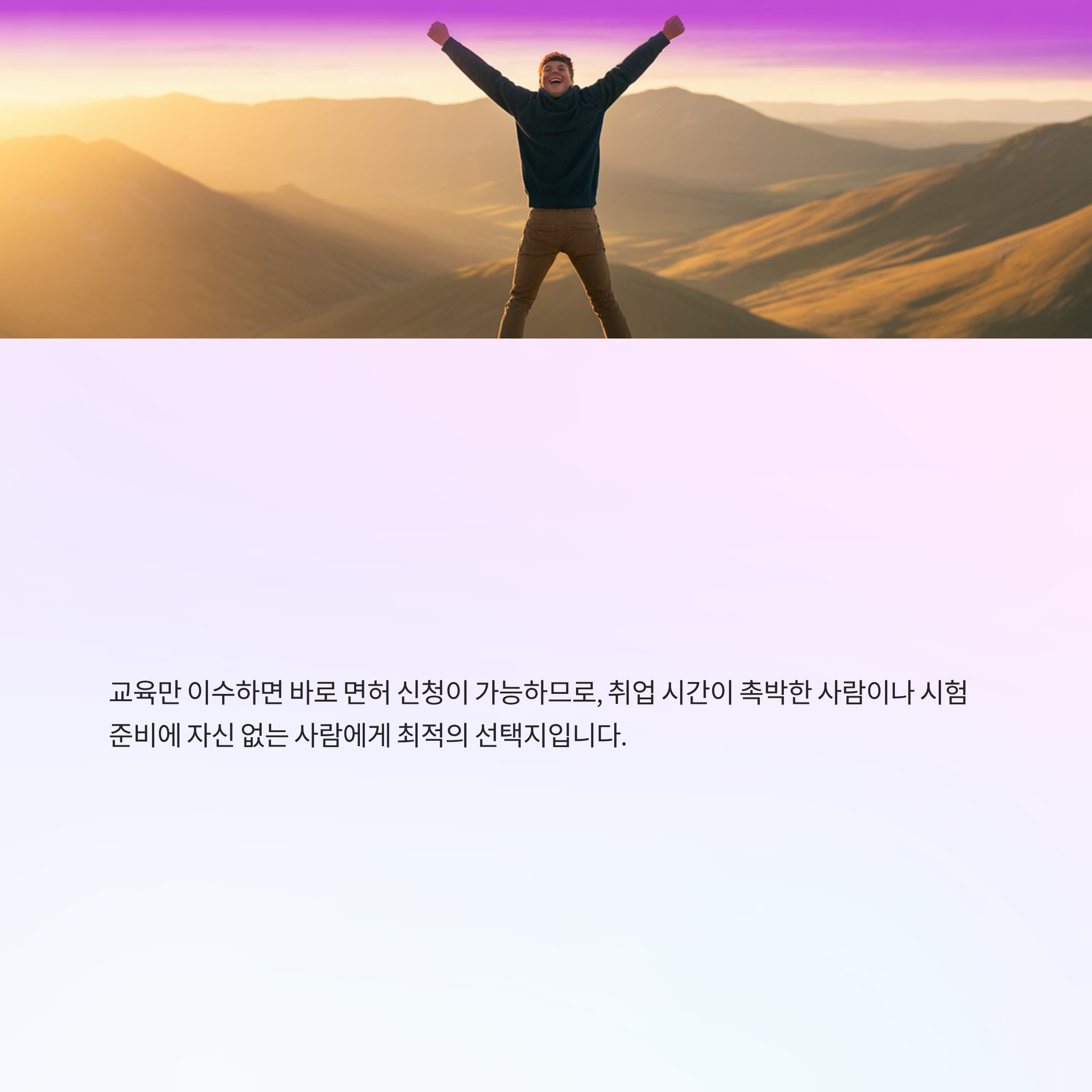 교육만 이수하면 바로 면허 신청이 가능하므로, 취업 시간이 촉박한 사람이나 시험 준비에 자신 없는 사람에게 최적의 선택지입니다.