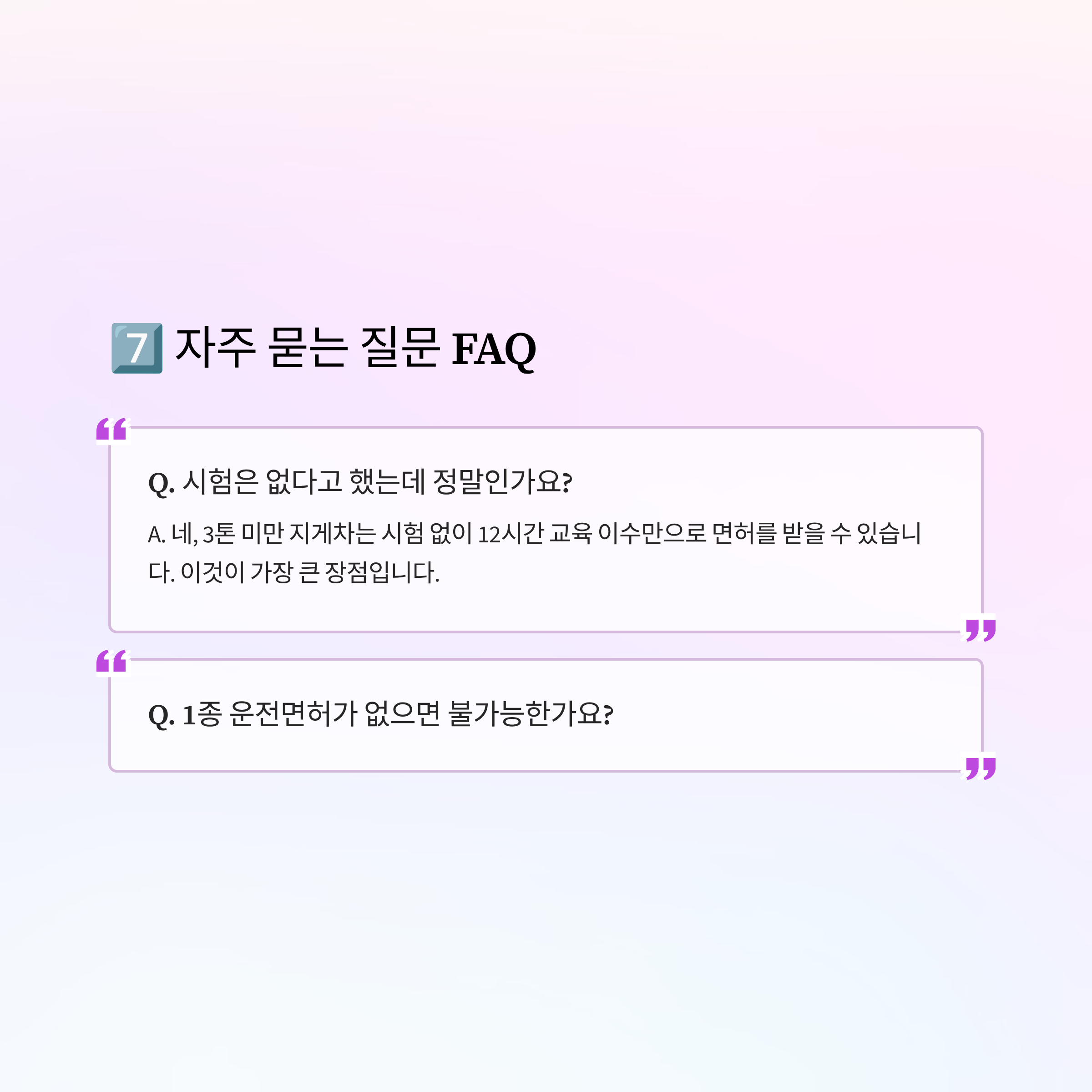 A. 네, 3톤 미만 지게차는 시험 없이 12시간 교육 이수만으로 면허를 받을 수 있습니다. 이것이 가장 큰 장점입니다.